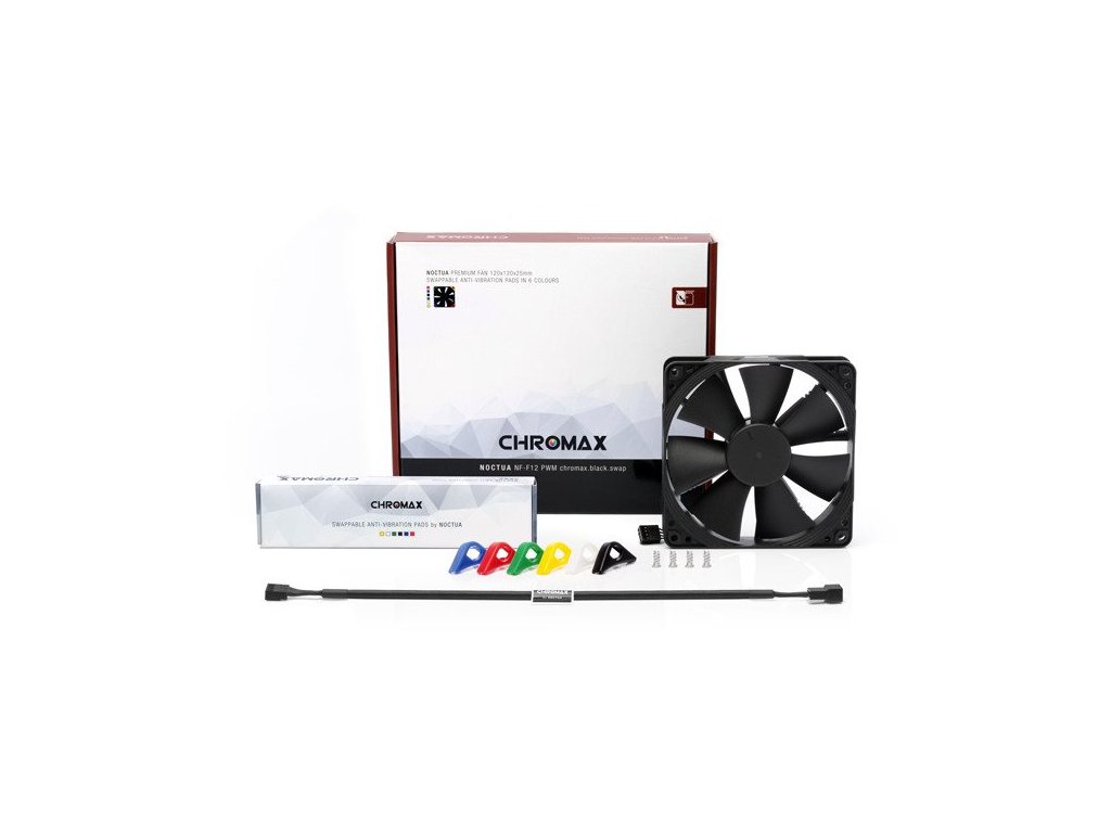 Špičkový ventilátor novej generácie NF-F12 PWM. Je vybavený druhou generáciou osvedčených SSO2 ložísk a novou PWM IC technológiou Smooth Commutation Drive (SCD) pre plne automatické riadenie rýchlosti otáčok, tichý chod a malú spotrebu. Edícia chromax.black.swap kombinuje tichý chod NF-F12 PWM s vynikajúcim chladiacim výkonom a atraktívny celo-čierny dizajn s vymeniteľnými farebnými antivibračnými podložkami. Podložky sú k dispozícii vo farbe červená, biela, modrá, zelená, žltá a čierna a umožňujú farebne prispôsobiť vetráčik designu zvyšku skrine. Pre ešte väčšie doladenie designu Noctua ponúka ďalšie farebné príslušenstvo ako napríklad interné káble, antivibračné podložky, antivibračné úchyty atď., ktoré je možné dokúpiť samostatne. Špecifikácia: * Rozmery: 120x120x25 mm * Rozstup montážnych dier: 105x105 mm * Konektor: 4-Pin PWM * Ložiská: SSO2 * Geometria lopatiek: Heptaperf * Technológia rámu: Focused Flow * Rýchlosť otáčok (+/- 10%): rýchlosť otáčok (PWM, +/-20%): 300 RPM * Prietok vzduchu: 93,4 m3/h * Akustický hluk: 22,4 dB(A) * Statický tlak: 2,61 mm H2O * Max. príkon: 0,6 W * Max. prúd: 0,05 A * Napätie: 12 V * MTBF: > 150.000 h * Balenie: Ventilátor 4 skrutky 4x NA-AVP1 chromax.black antivibračné podložky 4x NA-AVP1 chromax.blue antivibračné podložky 4x NA-AVP1 chromax. chromax.red antivibračné podložky 4x NA-AVP1 chromax.white antivibračné podložky 4x NA-AVP1 chromax.yellow antivibračné podložkyDodatočné parametre