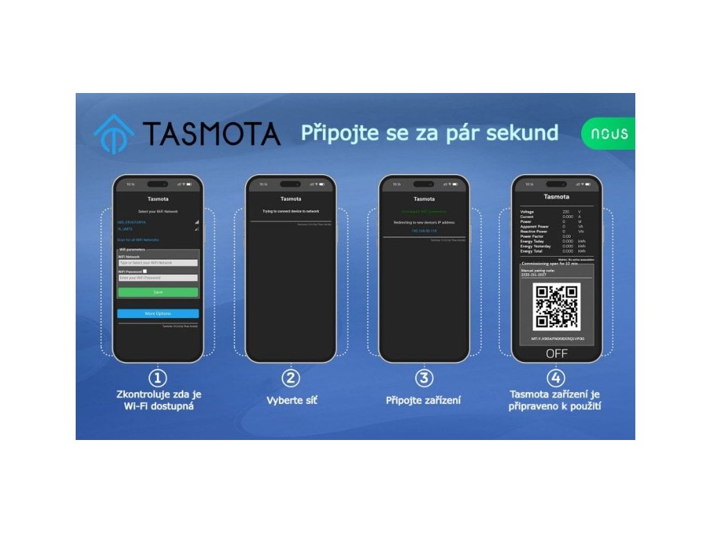 Inteligentný vypínač NOUS B3T premení akékoľvek zariadenie na inteligentné. Inteligentný spínač NOUS B3T s nainštalovaným softvérom Tasmota open je určený na organizovanie automatického a manuálneho vypínania elektrických spotrebičov v miestnosti prostredníctvom diaľkového prístupu cez Wi-Fi, smartfón alebo osobný počítač cez webové rozhranie. Komunikácia so spínačom sa konfiguruje prostredníctvom siete Wi-Fi, na čo sa používa bezdrôtový adaptér Wi-Fi. Spínač je vybavený mechanickým tlačidlom a svetelnou indikáciou stavu zariadenia. Zariadenie je vybavené elektromechanickým relé a podporuje protokol Matter. -Monitorovanie spotreby energie -Jednoduché pripojenie a ovládanie -Široká kompatibilita Parametre Certifikát. Materiál: PC V0 plast zpomalujúci horenie Rozmery zariadenia: 42 mm × 37 mm × 16 mm Maximálne zaťaženie: 10 A/kanál, 16 A spolu, DC: 10 A Prevádzková teplota: 0oC ~ 40oC Stupeň ochrany proti vlhkosti: IP20 802.11b/g/n Protokol: MQTT, Matter Frekvenčný rozsah: 2412 - 2484 MHz Maximálny vysielací výkon: 19,5 dBmDodatočné parametre