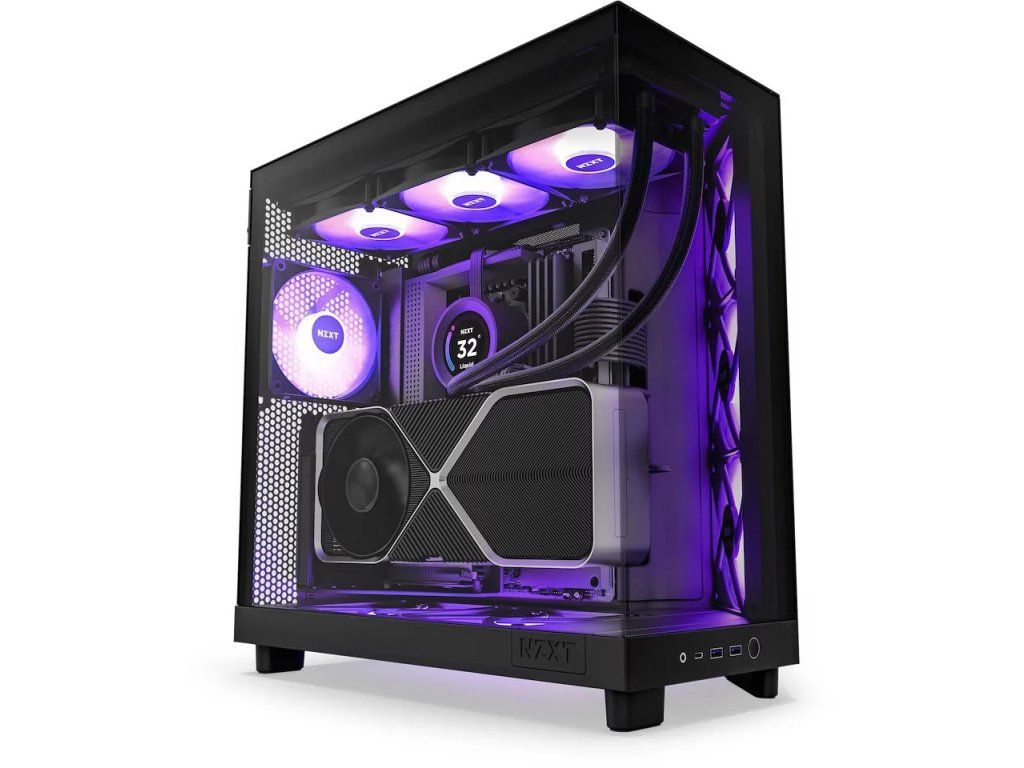 NZXT H6 Flow RGB Táto elegantná počítačová skriňa má štýlové sklenené bočnice a čelnú stranu, perforovaný panel a prémiovú kovovú konštrukciu. Osadenie komponentov je ľahké vďaka systému správy káblov, takže káble zbytočne neprekážajú. Skriňa je vybavená tromi 120 mm ventilátormi RGB. Poteší vás aj možnosť rozšírenia o ďalších šesť ventilátorov. Samozrejmosťou sú prachové filtre. Dômyselná konštrukcia umožňuje pohodlne umiestniť až 360 mm dlhý výmenník tepla vodného chladenia na hornú stranu alebo až 120 mm dlhý výmenník tepla na zadnú stranu. V skrini je dostatok miesta pre chladič procesora s výškou až 163 mm a grafickú kartu s dĺžkou až 365 mm. Na prednej strane sa nachádzajú dva porty USB 3.0, port USB-C a kombinovaný zvukový port pre sluchátka a mikrofón. Skriňa sa dodáva bez napájacieho zdroja. Ilustračná fotografia - komponenty zobrazené na úvodnej fotografii nie sú súčasťou dodávky. ZÁKLADNÉ ŠPECIFIKÁCIE Konštrukcia skrine: Stredná veža Vnútorné pozície: 1×3,5", 2×2,5" Kompatibilita so základnými doskami: ATX, Micro ATX, Mini ITX Napájanie: bez zdroja Konektory na prednom paneli: 1× USB-C 3.2 Gen2. 3.0), 1× kombinovaný port pre sluchátka a mikrofón Rozmery: 435 × 415 × 287 mm (výška s nožičkami) Hmotnosť: 9,4 kg Farba: čiernaDodatočné parametre