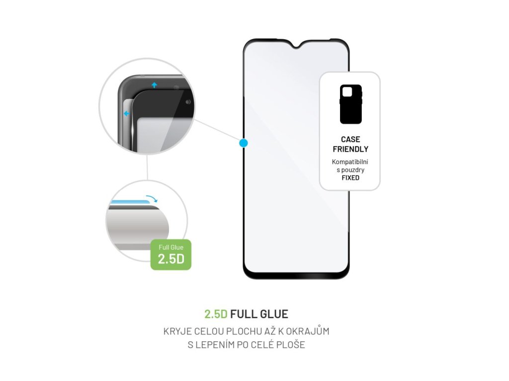 Vysokokvalitné tvrzené sklo FIXED Full-Cover s celoplošným lepením zabezpečuje maximálnu ochranu displeja mobilného telefónu. Predídete tak možnému poškodeniu v podobe prasknutého alebo poškriabaného displeja. Vďaka 2,5D konštrukcii sklo pokrýva celú plochu displeja až po okraje. Výhodou oproti bežným 2,5D sklám je lepenie po celej ploše displeja telefónu, takže sklo lepšie priľne k displeju, dokonale drží a netvoria sa na ňom mapy. Okrem toho má aj lepšiu citlivosť na dotyk. V balení nájdete všetko potrebné na jednoduchú inštaláciu. S krycím sklom FIXED Full-Cover získa váš telefón kompletnú ochranu pred nárazmi, poškriabaním a nečistotami. Vlastnosti: - zloženie displeja s ochranným krytom pre všetky typy displejov: - ochranné tvrzené sklo pre váš telefón - 2,5D - pokrýva celú plochu obrazovky až po okraje - lepenie po celej ploche skla - hrúbka: 0,33 mm - 100% priehľadnosť - oleofóbna struktura proti odtlačkom prstov - lepšia citlivosť - jednoduchá inštalácia bez vzduchových bublin - veľmi jednoduché čistenie - maximálna ochrana obrazovkyDodatočné parametre