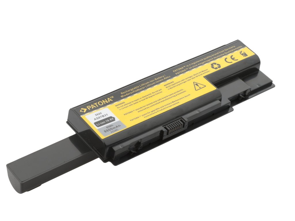 Batérie sa vyznačujú vysokou kvalitou, majú integrovanú ochranu proti preťaženiu a prebitiu. Batéria PATONA nová energia pre Váš notebook! Je potrebné brať do úvahy, že veľkosť batérie je väčšia, než rozmery originálnej batérie štandardne dodávané s notebookom a prístroj nemusí ísť plnohodnotne otvoriť. NUTNÉ DODRŽAŤ NAPÄTIE ORIGINÁLNEJ BATÉRIE !!! Aku ACER ASPIRE 5220 / 5920 8800mAh Li-Ion 10,8V Počet článkov: 12 Nahrádza tieto originálne batérie: AS07B31 AS07B32 AS07B41 AS07B42 AS07B51 AS07B70 AS0. Kompatibilné s notebookmi: Acer Aspire 5310 Acer Aspire 5520-6A2G12Mi Acer Aspire 5710Z Acer Aspire 5720 Acer Aspire 5920 Acer Aspire 5920-302G12Mi Acer Aspire 59 5920-658 Acer Aspire 5920G-302G16MN Acer Aspire 5920G-302G20H Acer Aspire 5920G-302G20N Acer Aspire 5920G-702G25Hn Acer Aspire 6964 Acer Aspire 6920G Series Acer Aspire 6920G-814G32Bn Acer Aspire 7520-5823 Acer Aspire 7520-6A1G08Acer Aspire 7720G-1A2G24Mi Acer Aspire 7720 7720G-602G50Mn Acer Aspire 7720G-603G50Hn Acer Aspire 7720ZG-3A1G16Acer Aspire 8920-6048 Acer Aspire 8920G-6A4G32Bn Acer Aspire 8 8920G-934G64Bn Acer Aspire 8930 Series Acer Aspire 8930G-864G32Bn Acer Aspire 8930G-864G64Bn Je potrebné brať do úvahy, že veľkosť batérie je väčšia, než rozmery originálnej batérie štandardne dodávané s notebookom.Dodatočné parametre