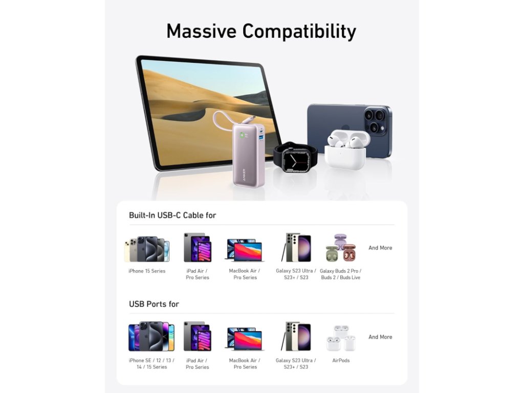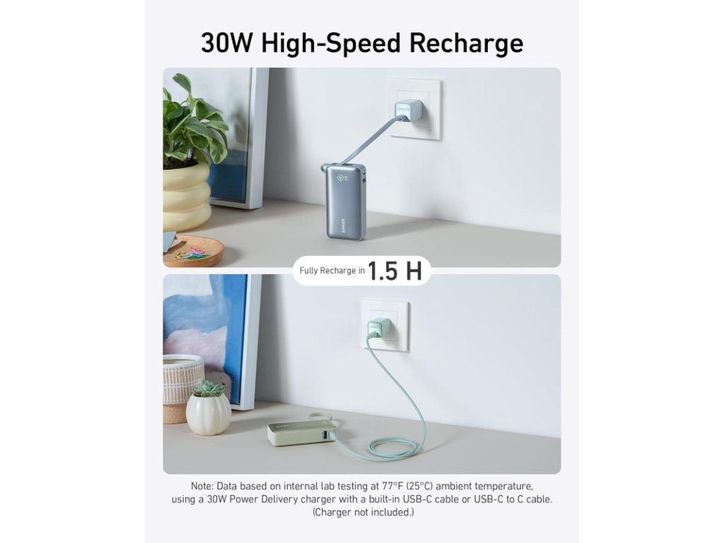 Anker 545 / Nano 10 000 mAh - 30 W powerbanka s integrovaným káblom USB-C (zelená)Kompaktná a výkonná powerbanka Anker 545 / Nano s kapacitou 10 000 mAh a rýchlym nabíjaním až 30 W je ideálnym spoločníkom na cesty, do práce alebo na výlety. Integrovaný kábel USB-C a ďalšie porty umožňujú pohodlné nabíjanie viacerých zariadení súčasne.
