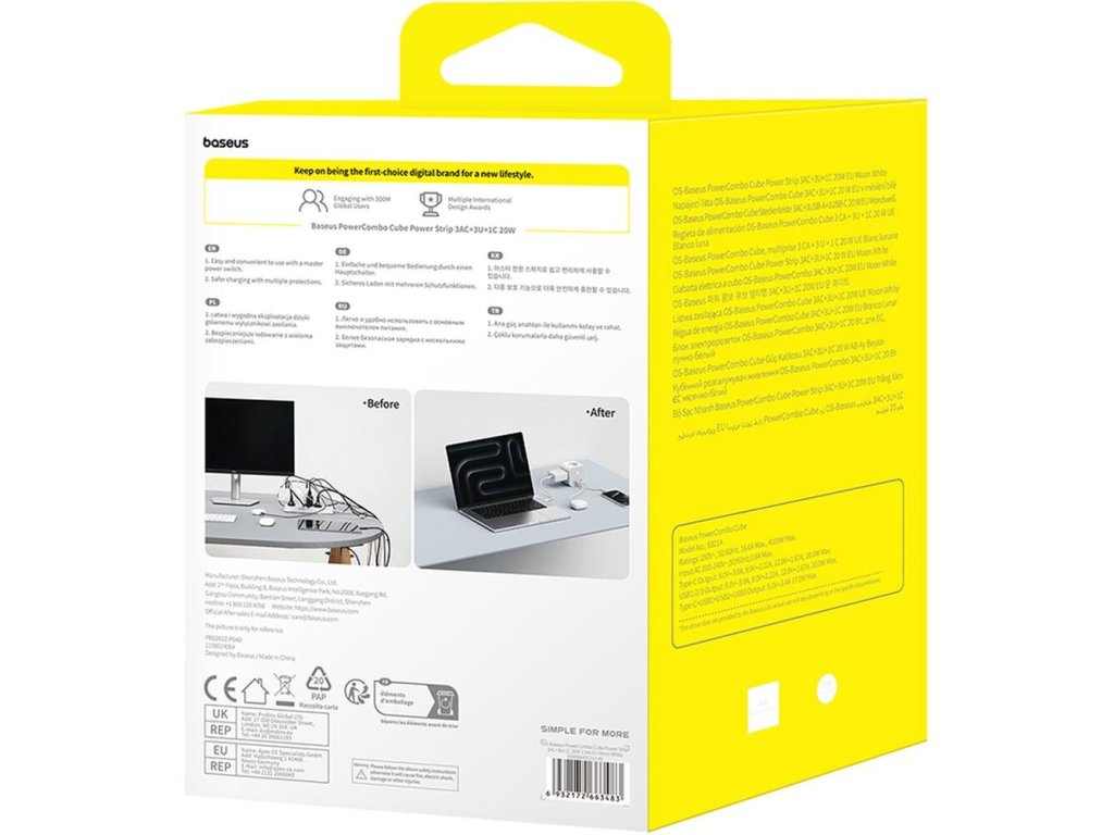 Baseus PowerCombo Cube je určený pre užívateľov, ktorí potrebujú efektívne a bezpečne napájať viacero zariadení súčasne. Tento kompaktný predlžovací kábel ponúka 3 zásuvky striedavého prúdu, 3 porty USB-A a 1 port USB-C s výkonom 20 W, čo umožňuje nabíjať a napájať až sedem zariadení súčasne. Vďaka 1,5 m napájaciemu káblu a modernému dizajnu je ideálny na použitie doma, v kancelárii aj na cestách. Kľúčové vlastnosti Počet zásuviek: 3x AC Počet portov: 3x USB-A, 1x USB-C Výkon portu USB-C: 20 W Dĺžka kábla: 1,5 m Konštrukcia: kompaktná a prenosná Bezpečnost: viacvrstvová ochrana Baseus PowerCombo Cube umožňuje nabíjať až sedem zariadení súčasne vďaka kombinácii 3 zásuviek AC-3 . Port USB-C podporuje rýchle nabíjanie s výkonom až 20 W, takže je ideálny pre moderné smartfóny a tablety. Porty USB-A poskytujú stabilné nabíjanie pre iné zariadenia, ako sú sluchátka alebo inteligentné hodinky. Táto všestrannosť zaručuje, že všetky vaše zariadenia budú vždy pripravené na použitie. Bezpečnosť a ochrana vašich zariadeníDodatočné parametre