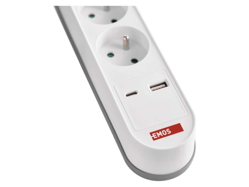 Predlžovací kábel Emos 3 m / 5 zásuviek / s vypínačom / biely / 1×USB-A + 1×USB-C / 1,5 mm2