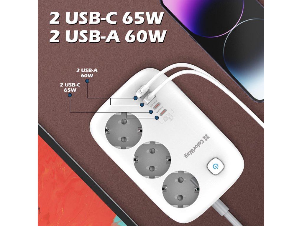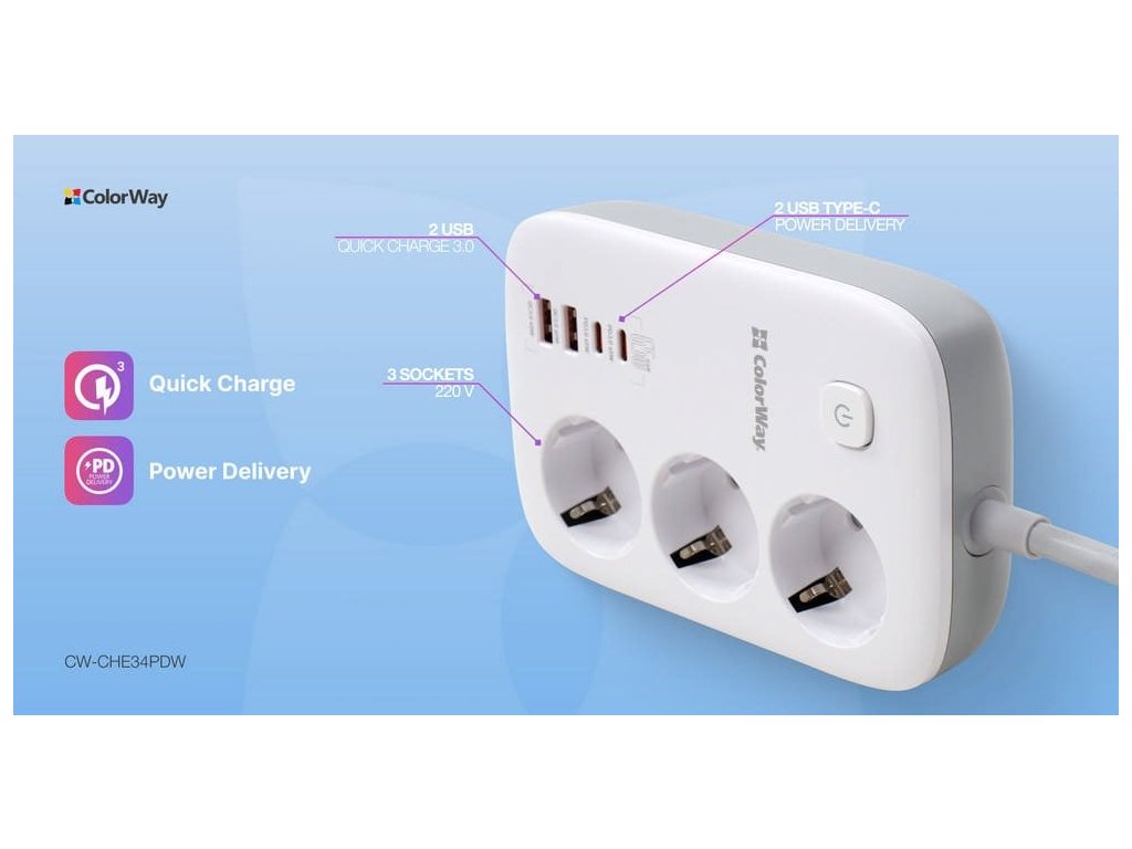 ColorWay CW-CHE34PDW Prodĺžovací kábel s tromi zásuvkami Schuko, dvoma portami USB a dvoma portami USB-C. Možno ho preto použiť nielen na pripojenie elektrických spotrebičov, ale aj na nabíjanie až štyroch mobilných zariadení súčasne z portov USB. Funkcia Auto ID automaticky rozpozná typ pripojeného zariadenia a určí vhodný nabíjací proud. Medzi podporované nabíjacie protokoly patria PD 2.0/3.0 PPS, Quick Charge 2.0/3.0/4.0+, Apple Fast Charge, Huawei FCP/SCP, Samsung SFC/AFC, VOOC a Xiaomi Turbo charge. Je vybavená praktickým tlačidlom zapnutia/vypnutia. Telo napájačky je vyrobené z tepelne odolného plastu, ktorý vydrží teplotu až 750 °C. Samozrejmosťou je uzemnenie a prepätová ochrana. ZÁKLADNÉ ŠPECIFIKÁCIE Menovitý preud: 13 A Menovité napätie: 250 V Počet zásuviek: Počet zásuviek: 3× zásuvka Schuko 2× USB: 5 V/3 A, 9 V/3 A, 12 V/3 A, 2 V/3 A (max. 60 W) 2× USB- V/3 A, 15 V/3 A, 20 V/3,25 A (max. 65 W) / PPS 3,3-11 V /5 A, 3,3-21 V /3,25 A (max. 65 W) Dĺžka kábla: 2 m Rozmery: 156 × 103 × 43 mm Farba:Dodatočné parametre