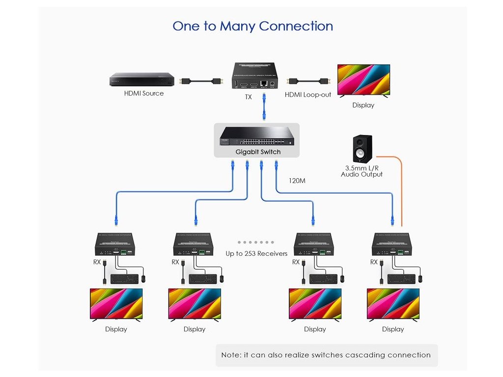 PremiumCord 4K @ 60Hz HDMI KVM extender do 120 m cez LAN, cez IP Zariadenie umožňuje prenášať signál 4K @ 60Hz HDMI, klávesnicu a myš až na 120 ma IR signály súčasne cez jeden sieťový kábel alebo LAN. Signál možno distribuovať na viacero monitorov prostredníctvom siete LAN, najlepšie gigabitovej siete a gigabitových prepínačov, ako je znázornené na schéme zapojenia. - Extender umožňuje použitie jedného vysílača a viacerých prijímačov prepojených sieťou LAN, prepínačmi a smerovačmi (testované na 4k @ 60hz a FULL HD 1080p a 60 m kábla + prepínač + 2 prijímače) táto počítačová sieť musí byť vyhradené len pre extender HDMI, nesmie sdielať iné počítače, tlačiarne a iné sieť. - K extenderu je možné pripojiť až 253 prijímačov a pripojiť ho prostredníctvom prepínačov k jednému vysílaču. - Podporuje 4K@60Hz 4:4:4 alebo FULL HD 1080p až do vzdialenosti 120 m pomocou kvalitnej siete Cat6/6A/7 - Extender je KVM, umožňuje ovládať viaceré klávesnice a myšou cez sieť z jedného počítača, ktorý je zdrojom signálu HDMI - Zpôsob pripojenia: jeden k jednému 2.0 - Podporuje HDCP 2.2 a HDCP 1.4 - Pre rozlišení: 720p@50/60Hz, 1920x1200@60Hz, 2560x1440@60Hz, 2560x1600@60Hz, 1080p@50/6 3840x2160@24/30/50/60Hz - Podporuje formát videa: 24-bit / Deep color 30-bit / Deep color 36-bit - Podporuje zvuk: DTS-Audio/Dolby Digital 5.1/LPCM2.0 - Prenosová rýchlosť: 18 Gb/s - Odoskorenie: 8. - Kabel LAN TIA/EIA568 B - Na pripojenie odporúčame vysokokvalitný kábel LAN Cat6, Cat6A, Cat7 - Vysielač a prijímač sa napájajú pomocou priložených napájacích adaptérov 230V/5V 2A - Vysielač a prijímač majú praktické tlačidlo RESET - Vysielač a prijímač majú signalizačné LED diódy signálu. - odporúčané vstupné a výstupné káble HDMI kratšie ako 5 m - IR frekvencia: 20 kHz - 60 kHz - prenosová rýchlosť RS232: predvolená: 115200, podporuje: 2400,4800,9600,19200,38400,57600,1 menej ako 4 W - Rozmery vysielača a prijímača: dĺžka: 106 mm, šírka: 103 mm, výška: 20,6 mm - Hmotnosť: TX: 315 g, RX: 307 g - Prevádzková teplota: -20 °C až 60 °C Balenie: Balenie: 1x vysielacia jednotka 1x prijímacia jednotka 2x IR káble 1x manuál 2x napájací adaptér 5V/2ArDodatočné parametre