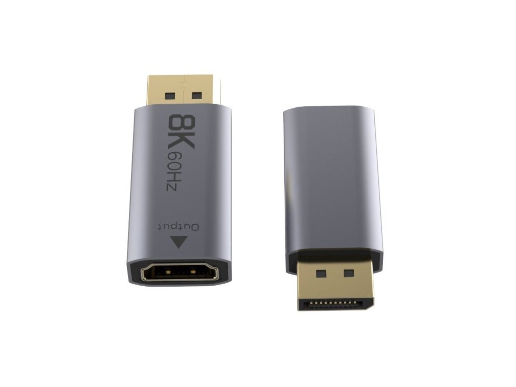 PremiumCord 8K@60Hz, 4K@144Hz, adaptér DisplayPort 1.4 na HDMI, samec/samica, pozlátené konektory, kovový dizajn konektorov - Umožňuje pripojit monitor HDMI k počítaču s výstupom DisplayPort a zobrazovať v najvyššom rozlišení a kvalite - Podporuje rozlišení ULTRA HD 8 2K@165Hz/240Hz a FULL HD 1080p - Vstup kompatibilný so štandardom Displayport 1.4 - Podpora plného pripojenia Displayport - Výstup kompatibilný s HDMI 2.1 a 2.0 - Adaptér DP 1.4 NA HDMI, adaptér možno zapojiť a používať len v smere DP ako vstupný signál 480i,576i,480p,576p,1080i,1080p, 2K165Hz/240Hz, 4K@60Hz/144Hz, 8K@60Hz - Pozlátené konektory - Kovové hliníkové telo adaptéra - Čip: VMM7100 (Synopsys) Výstup: HDMI / samec (výstup signálu) - Podpora prenosu zvuku - Farba: vesmírne sivá - Balené v PE kapse so závesným štítkom a EAN kódomDodatočné parametre