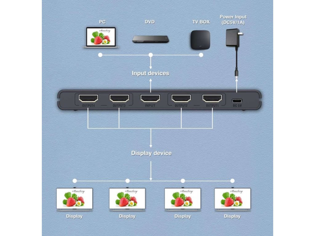 Popis produktu: Rozdeľovač HDMI 2.0 PremiumCord 1-4 porty, 4K x 2K/60Hz, FULL HD, 3D, HDR Môžete pripojiť viacero obrazoviek HDMI k jednému zdroju signálu HDMI, ako je PC, notebook, DVD, set top box atď. - 1 x zásuvka HDMI (typ A) - Výstup: 4 x V/5 V 1A - 1xLED indikacia napájania na prednom paneli, 4xLED indikacia signálov na portoch - Podporuje 3D a HDTV až do Ultra HD 3840X2160/60HZ, YUV 4:4:4 chroma - Rozlíšenie: 480i, 480p, 7 1080p, 4Kx2K/60Hz - Podporuje HDR (zobrazovanie s vysokým dynamickým rozsahom) - Podporuje HDMI 2.0, HDMI1.4 - Podporuje HDCP2.2 - Rozdeľovač obsahuje atívny zosilňovač signálu, ktorý umožňuje pripojiť káble s dĺžkou až 10 m za rozdelovač. Kabely musia mať kvalitné medené vodiče a dostatočný prierez vodičov (min. AWG24) pre dĺžku kábla a použité rozlišenie videosignálu. - Šírka pásma (MHz): 25 MHz - 600 MHz. - Maximálna rýchlosť prenosu dát 18 Gb/s - Podpora zvukových formátov: 7.1/5.1/2.1 CH Dolby Digital, DTS-HD a Dolby TrueHD audio - Podpora 8/10/12 bitovej farebnej hĺbky - Prenáša obraz aj zvuk - Pekný malý černý plastový kryt - Spotreba menej ako 4 W - Prevádzková teplota: 0 - 60 - rozmery: 158,5 mm x 82,8 mm x 16 mm - hmotnosť: 136 g - balené v papierovej krabici s kódom EAN Návod na zapojenie: 1) Pripojte vstup rozdelovača HDMI pomocou kábla HDMI k zdroju signálu a výstup pripojte k zobrazovacej jednotke alebo monitoru. 2) Zapojte napájací adaptér do zásuvky 230 V a do zásuvky DC 5 V. Ak sa obraz nezobrazí ihneď po zapojení rozdelovača, počkajte približne 30 s, kým sa rozpozná signál HDMI.Dodatočné parametre