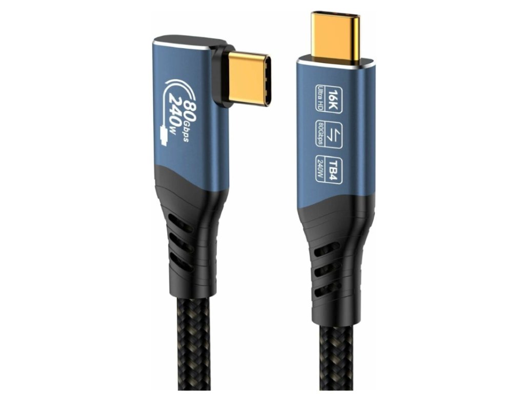 PremiumCord USB4™ Version2.0 80Gbps 16K@60Hz 240W Thunderbolt 3 a 4 kabel zahnutý 90° délka 1m Tento kabel USB4™ Version2.0 nabízí extrémně vysokou přenosovou rychlost až 80 Gbit/s, takže je ideální pro datově náročné aplikace. Přeneste videa ve vysokém rozlišení až 16K na monitory a televizory, vychutnejte si ostrý obraz a vynikající zvuk. Umožňuje napájet nebo nabíjet až do výkonu 240W. - Kabel vhodný také na propojení monitoru s rozlišením až 16K@60hz, 8K@60hz nebo 4K@120hz - První konektor: USB typ C samec zahnutý 90° - Druhý konektor: USB typ C samec rovný - Bezkonkurenčních 80 Gbit/s zajišťuje bleskově rychlý přenos dat – kabel USB-C je 16x rychlejší než USB 3.0 a ideální pro pevné disky NVMe, HD filmy, seriály, hudbu a fotografie. - Špičkový výkon díky asymetrickému přenosu dat, podporovanému systémem Windows 11 (sestavení 23615): USB4™ Gen 4 umožňuje rychlost stahování 120 Gbit/s se současnou rychlostí odesílání 40 Gbit/s. - Podporuje rozlišení: 16K/60Hz (15360x8460) Quad UHD, 8K/60Hz (7680x4320) Full UHD, 4K/60Hz (3840x2160) UHD, HDR - Dosud nejflexibilnější USB kabel, umožňuje tunelování dat z DisplayPort™ 2.1 a PCIe™ 4.0 a lze jej připojit přímo k portům s Thunderbolt™ 4 nebo Thunderbolt 3™ - Napájení 48V / 5A ( Napájení PD3.1, výkon napájení až 240W ) - Podporuje rychlonabíjení USB Power Delivery PD 2.0 / PD 3.0 , 240W (48V/5A) - Podporuje rychlonabíjení QC 2.0 / QC 3.0 / QC4+: Qualcomm Quick Charge - Rozlišení videa 16K@60Hz, až 80Gbps (podporuje DisplayPort Alt Mode 2.0) - Podporuje HDR10 a je ideální pro streamování HD videa na externí monitory, televizory nebo projektory, např. z chytrých telefonů, notebooků, tabletů a dalších hostitelských zařízení - USB4™ je kompatibilní s high-end herními komponenty, např. Razer Blade 18, Corsair Voyager, Apple Studio Display nebo procesory AMD Ryzen (Zen 3+, Zen 5) - Zalévané konektory v hliníkovém pozdře zaručují dokonalou pevnost a stabilitu - Chipset: EJ903C/U - E-Marker pro USB-C kabely - Koaxiální měděné vnitřní vodiče umožňují vysoký datový přenos - Materiál pláště TPE, který kombinuje vlastnosti gumy a PVC a vyniká ohebností a velkou pevností - Trojité stínění - Kabel potažen jemným bavlněným potahem - Barva kabelu: černá - Hliníkové konektory barvy: modrá s potiskem - Balení PVC sáček s etiketou a EAN kódem - Délka: 1mDodatočné parametre