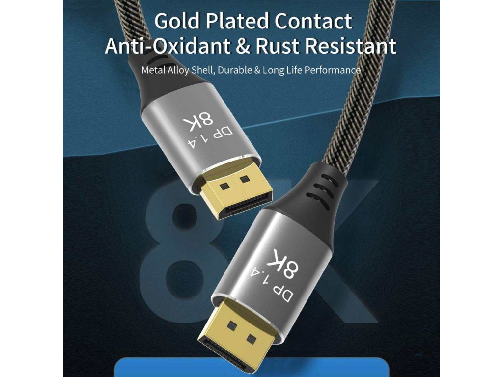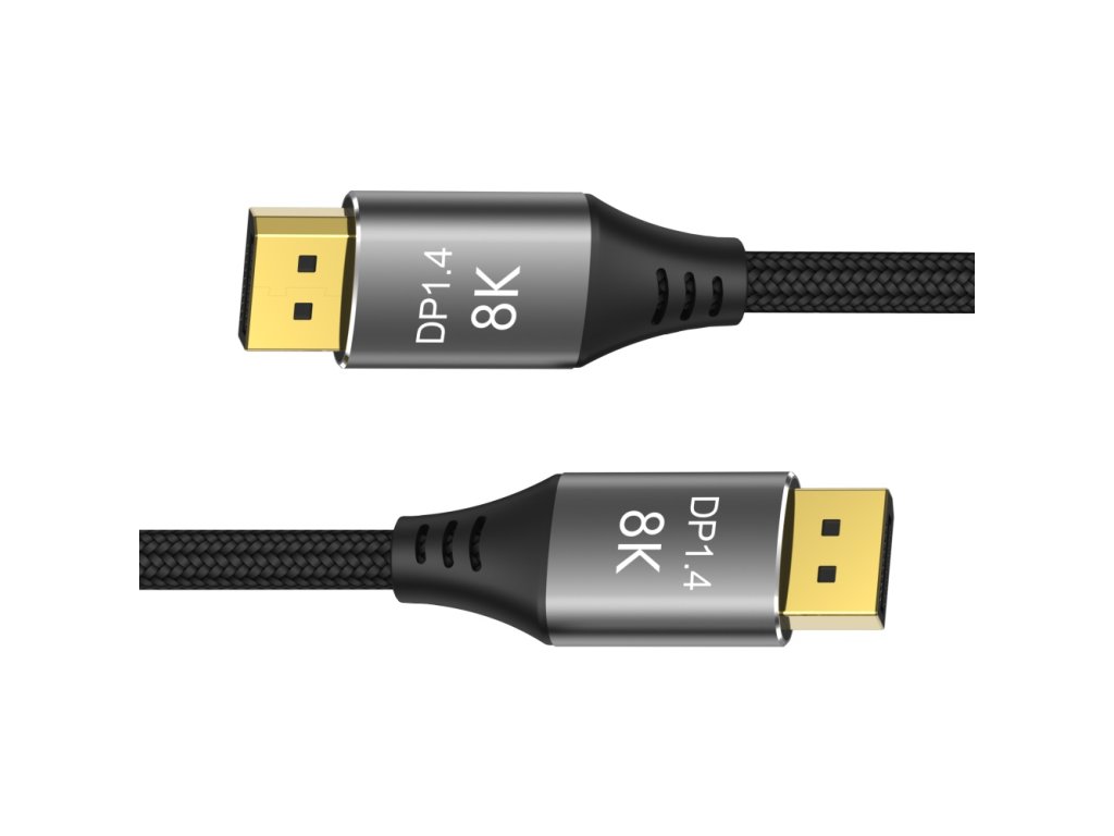 Pripojovací kábel PremiumCord DisplayPort 1.4 32,4 Gbit/s, rozlíšenie 8K, kovové a pozlátené konektory, 9 m. - DisplayPort 1.4 zvyšuje maximálnu rýchlosť prenosu dát o 50% oproti DisplayPort 1.2 na 32,4 Gbit/s. hĺbke - 4K (3840×2160) pri 144 Hz a 60 Hz a 24-bitovej farebnej hĺbke - 2K (2560×1440) pri 240 Hz a 165 Hz - FULL HD 1080p (1920 × 1020) HDCP1.4 - Podporuje 3D a EDID - Kabel podporuje FreeSync a G-Sync, Dynamic HDR, ako aj 32 zvukových kanálov a mnoho populárnych zvukových formátov, ako napríklad DTS-HD Master Audio - DisplayPort verzia 1.4 - Maximálny prenos dát: 32,4 Gb/s - Podporovaná hĺbka farieb: ( 4, 4 Konektory: DisplayPort (20pin) samec DisplayPort (20pin) samec - Vďaka špičkovému dizajnu je kábel vhodný na všetky druhy inštalácií. - Flexibilný prémiový kábel s tenkými kovovými konektormi, ochranou proti ohnutiu a farebne zladeným textilným káblom. - Pletený textilný plášť kábla monitora je príjemný na dotyk a šetrný k citlivým povrchom. mäkkým bavlneným opletením: černošedá farba - Farba konektora: vesmírne sivá - Balené v PVC kapse s kódom EAN a popisom - Dĺžka kábla: 9 mDodatočné parametre
