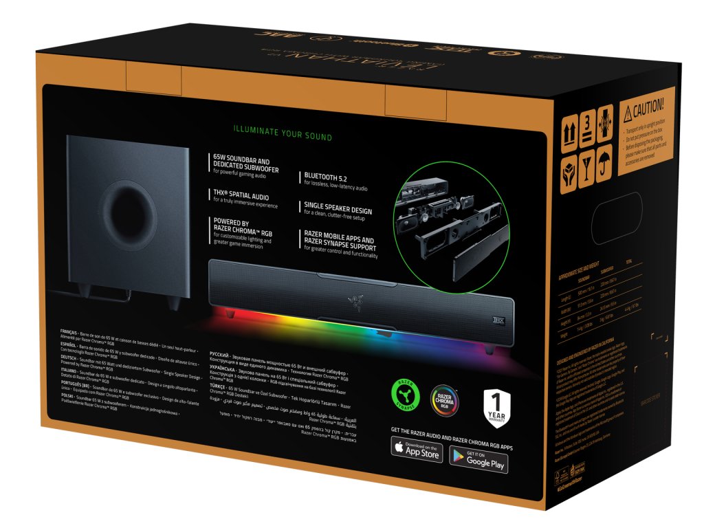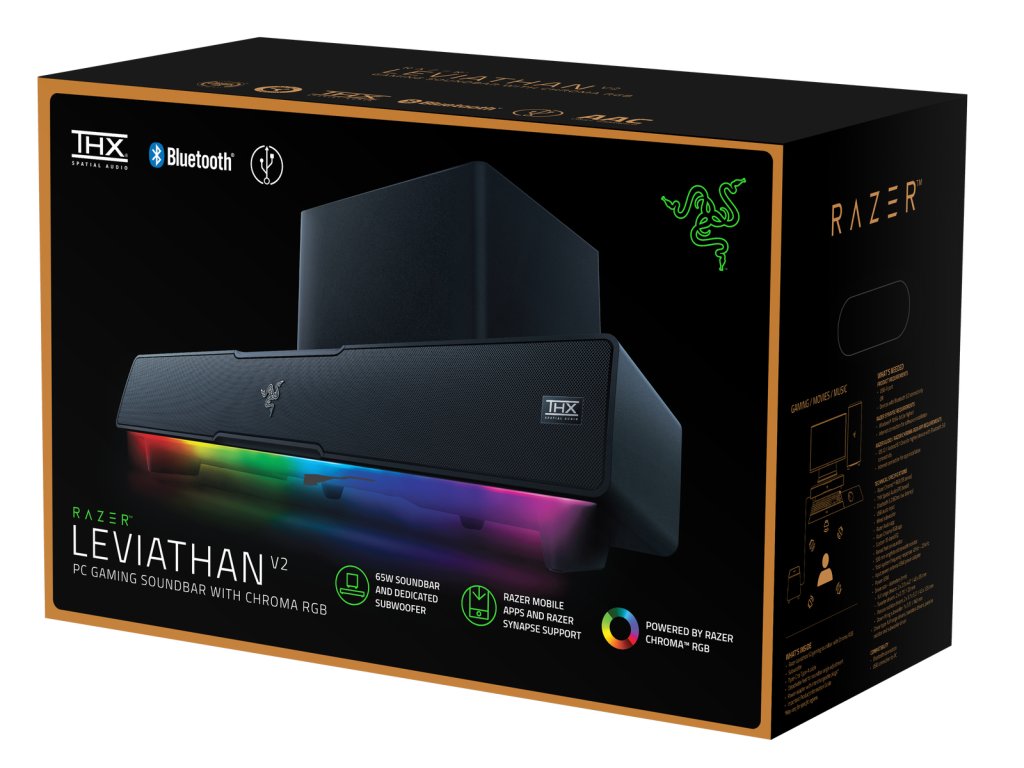 Rozšírte svoju zostavu všetkými možnými spôsobmi s Razer Leviathan V2 - herným soundbarom a subwooferom s THX Spatial Audio a Razer Chroma ™ RGB. Zažite bezkonkurenčné ponorenie do obrazu a zvuku, podporené technológiou Bluetooth 5.2 s nízkou latenciou pre bezproblémové používanie počítača a mobilných zariadení. Soundbar a subwoofer pre PC s viacerými meničmi pre ostré, čisté výšky a hlboké, pôsobivé basy. Vďaka 2 meničom s plným rozsahom, subwoofera smerujúcemu dolom a ďalším prvkom je náš zvukový systém "všetko v jednom" navrhnutý tak, aby poskytoval zvuk s plným rozsahom a vysokou vernosťou, ktorý pozdvihne váš zvukový zážitok. Náš pokročilý priestorový zvuk 7.1 poskytuje zvuk s úplnou vernosťou, čo umožňuje realistickejšiu a detailnejšiu zvukovú scénu, vďaka ktorej vaše filmy, hry a hudba skutočne ožijú. Kompaktný soundbar sa dokonale pomestí pod monitor, aby vám na stole neprekážal, zatiaľ čo odnímateľné gumové nožičky ho udržia v uhle smerom k vám a minimalizujú prekážky zvuku. Vychutnajte si plynulý zvuk bez chvenia vďaka pripojeniu Bluetooth 5.2 s nízkou latenciou pri prepínaní z počítača až na 8 ďalších zariadení pohodlne spárovaných prostredníctvom aplikácie Razer Audio. Využíva technológiu Razer Chroma™ RGB pre lepšie prispôsobenie a pohltenie. S 18 svetelnými zónami, nespočetným množstvom vzorov, dynamickými svetelnými efektmi v hre - zažite úplné prispôsobenie RGB a hlbšie ponorenie v najväčšom svetelnom ekosystéme pre herné zariadenia na svete. Od osvetlenia RGB až po nastavenie zvuku - dolaďte soundbar tak, aby čo najlepšie vyhovoval vašim potrebám v oblasti zábavy, pomocou softvéru navrhnutého tak, aby ste mali väčšiu kontrolu a väčšie pohodlie. Razer Chroma™ RGB (18 zón) Priestorový zvuk THX (PC cez Synapse 3) Bluetooth 5.2 (60 ms nízka latencia) USB audio vstup Kabelový subwoofer Aplikácia Razer Audio Aplikácia Razer Chroma RGB Vlastný 10-pásmový ekvalizér Rýchlo prepína 20 kHz Vstupný výkon: 65 W Špecifikácia soundbaru: Plný rozsah reproduktorov: 2x 48 x 95 mm Výškové reproduktory: 2 x 20 mm Pasívne meniče: 2 x 43 x 135 mm Subwoofer smerujúci dolom: 1 x 140 mm Typ meniča: meniče subwooferu Hmotnosť: Soundbar: 1,4 kg Subwoofer: 3,0 kg Rozmery: Soundbar: 500 x 91,3 x 84 mm Subwoofer: 220 x 220 x 241,5 mm Kompatibilita: Pripojiteľnosť cez Bluetooth Pripojenie USB k PCDodatočné parametre