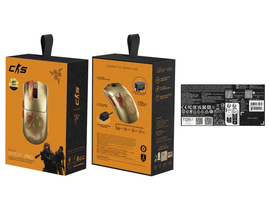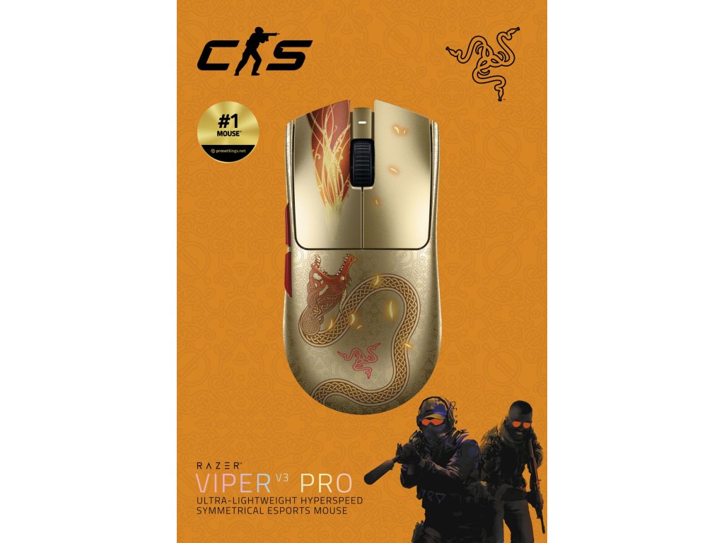 Oblíbenec bezdrátových esportových myší se vrací, aby přetvořila konkurenční scénu, teď v edici Counter-Strike 2 Dragon Lore. Díky ultralehkému designu 54 g a nejlepším technologiím ve své třídě je Razer Viper V3 Pro nespornou volbou pro špičkový výkon a ovladatelnost – dokonalá zbraň navržená s profesionály, které důvěřují. Skvěle vyvážený ultralehký design Viper V3 Pro, navržený ve spolupráci se světovými profesionály v oblasti esportu, vám umožní provádět rychlé a přesné pohyby, které odpovídají každému vašemu záměru. Zažijte prvotřídní výkon sledování na širší škále povrchů včetně skla, podporovaný inteligentními funkcemi a krokovými úpravami 1 DPI pro podrobnější zaměřování a ovládání. Díky kombinaci Razer HyperPolling s ultra-hladkým připojením Razer HyperSpeed zažijete bezchybný bezdrátový výkon se skutečnou frekvencí dotazování až 8000 Hz. Díky optimalizovanému designu dongle, který nedělá žádné kompromisy při připojení, si užijte špičkový bezdrátový výkon, který zůstává hladký a spolehlivý i v hlučném turnajovém prostředí. Vychutnejte si spolehlivost a rychlost, která předčí všechny ostatní, od vylepšeného životního cyklu 90 milionů kliknutí s nulovými problémy s dvojitým kliknutím až po bleskovou aktivaci 0,2 ms bez zpoždění. Vybavte se svými nejintenzivnějšími scrimováním a rozvrhem turnajů s až 95 hodinami vysoce výkonného kompetitivního hraní. Symetrické provedení pro praváky PŘIPOJENÍ: Razer HyperSpeed Wireless Wired ŽIVOTNOST BATERIE: Až 95 hodin při 1000 Hz Až 17 hodin při 8000 Hz SENZOR: Optický snímač Focus Pro Gen-2 MAXIMÁLNÍ CITLIVOST: (DPI) 35000 MAXIMÁLNÍ RYCHLOST: (IPS) 750 MAXIMÁLNÍ ZRYCHLENÍ: (G) 70 PROGRAMOVATELNÉ TLAČÍTKA: 6 TYP PŘEPÍNAČE: Optické spínače myši Gen-3 ŽIVOTNÍ CYKLUS PŘEPÍNAČE: 90 milionů kliknutí PROFILY PALUBNÍ PAMĚTI: 1 NOHY MYŠI 100% PTFE KABEL: USB typu A na USB typu C ROZMĚRY: 127,1 mm / 63,9 mm / 39,9 mm VÁHA: 54 gDodatočné parametre