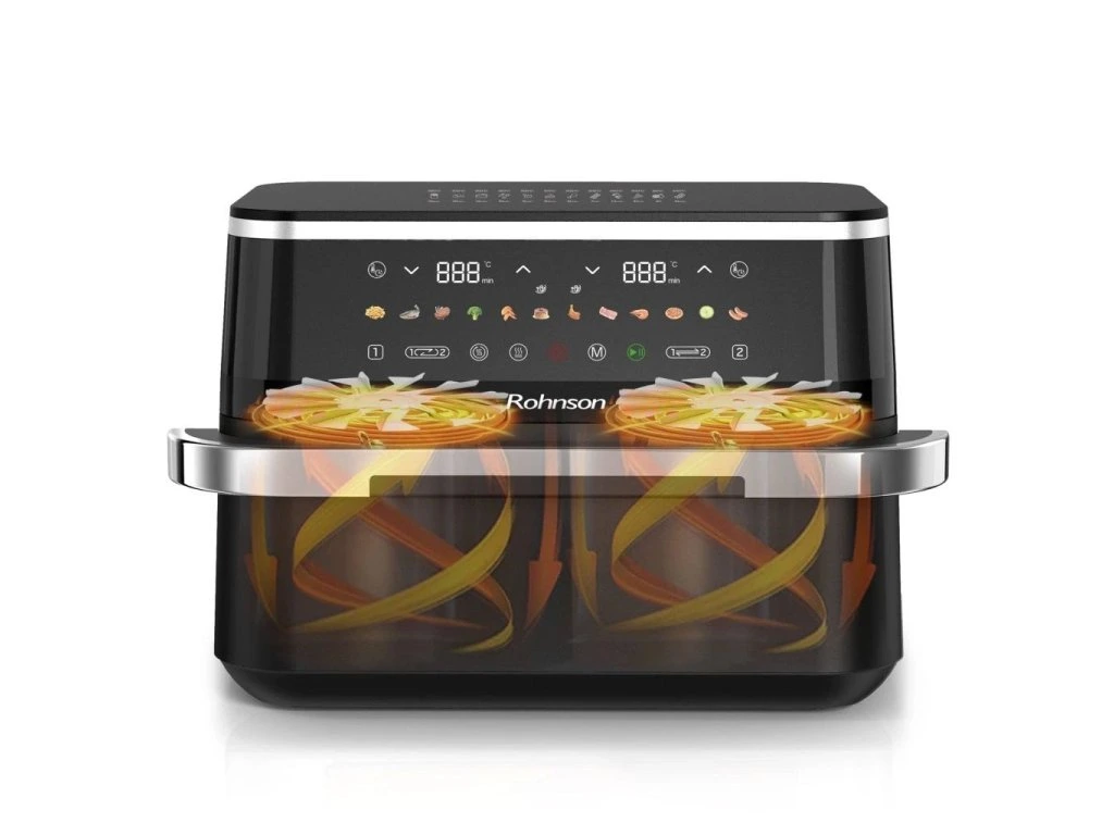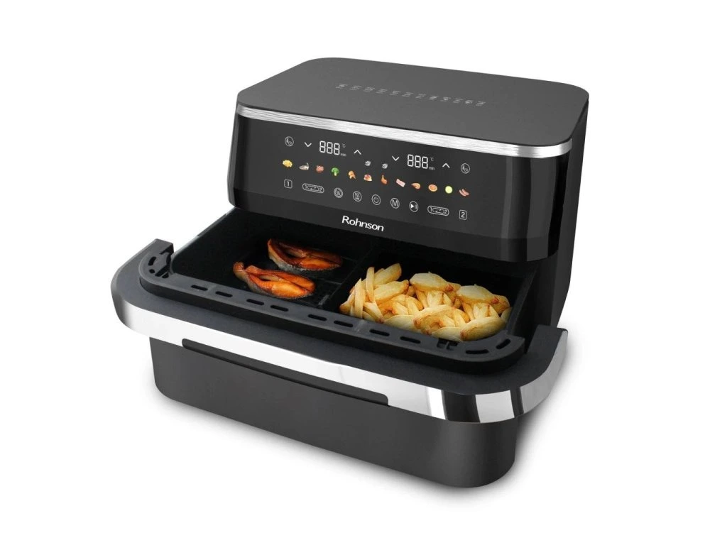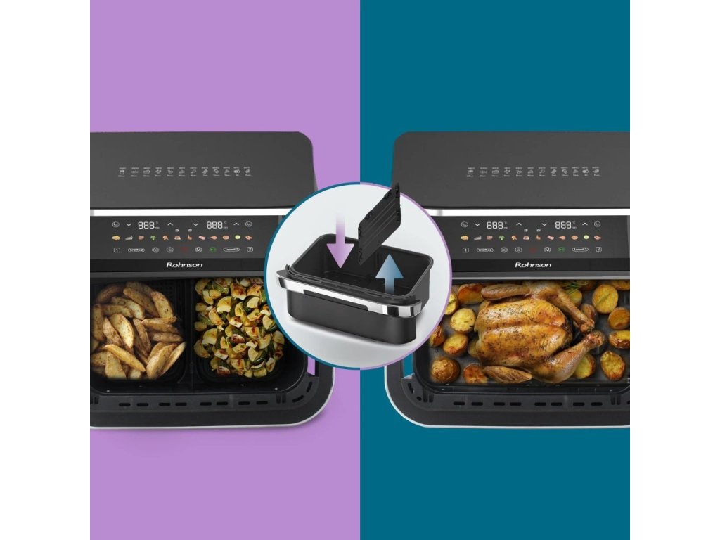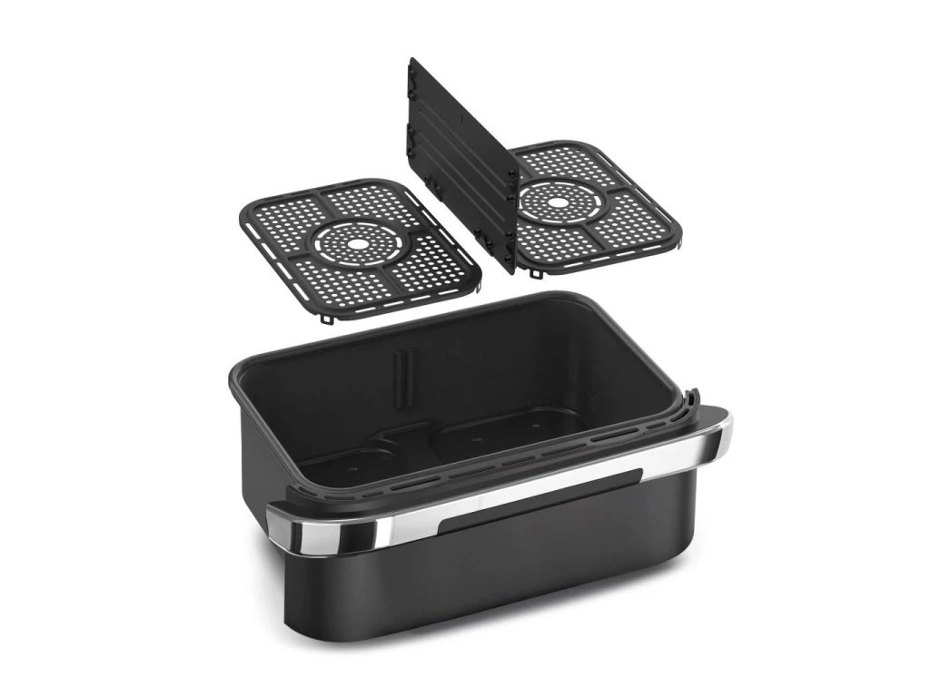 Teplovzdušná fritéza 2 v 1 s dvojzónovým košomIdeálna na prípravu 2 rôznych potravín súčasne