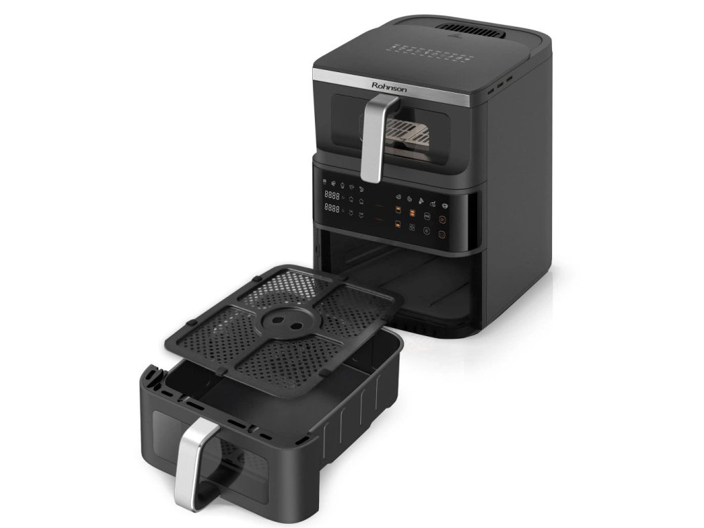 Inovatívna teplovzdušná fritéza s dvoma košmi Fritovanie s nízkym obsahom tuku - až o 80 % menej oleja Zdravšia príprava jedla bez nepríjemných pachov 360° 3D rovnomerný systém ohrevu Ideálne na prípravu 2 rôznych potravín súčasne Mimoriadne veľký objem 10 l s dvoma samostatnými košmi (horný 3,5 l / dolný 6,5 l) Priezor na sledovanie priebehu prípravy jedla Veľký dotykový LED panel s 10 prednastavenými automatickými programami Integrované vnútorné osvetlenie na sledovanie stavu prípravy jedla Technológia Cook Assist: jednoduchý alebo kombinovaný ohrev potravín, pripomienka miešania a synchronizovaný čas dokončenia Nastavenie teploty od 80 °C do 200 °C Nastaviteľný 60-minútový časovač s automatickým vypnutím Tepelne izolovaná rukoväť Ochrana proti prehriatiu Príslušenstvo vhodné na umývanie v umývačke riadu Zdravotne bezpečný povrch bez BPA a PFAS Príkon 2500 W (horný 1000 W / dolný 1500 W) Kategória: Teplovzdušné fritézy Záruka: 2 roky EAN: 5202561546385 Automatické vypnutie: Áno Časovač: 1 - 60 min. Dĺžka napájacieho kábla: cm Displej: Áno: Funkcia pripomenutia miešania: Áno Indikácia času: Áno Indikácia dosiahnutej teploty: Áno Materiál fritovacej nádoby: Materiál: za studena valcovaná oceľ + nepriľnavý povrch Materiál fritovacieho koša/štítu: Materiál: za studena valcovaná oceľ + nepriľnavý povrch Nastaviteľná teplota: 80 - 200 °C Nastaviteľný časovač: Áno Nepriľnavý povrch: Áno Kapacita fritovacieho hrnca: 10 (horný 3,5 / dolný 6,5) l Ochrana proti prehriatiu: Áno Ovládacie prvky: Dotykové ovládanie: Počet fritovacích košov/roštov: 2 Počet prednastavených programov: 10 Protišmykové nožičky: Áno: . Spotreba energie: 2500 W Rozmery grilu: cm Sklenený priezor: Sklenené sklo: Áno Sušenie ovocia: Nie Svetelná indikácia prevádzky: Áno Šírka: cm Tepelne izolovaná rukoväť: Áno Termostat:: Áno Tvar fritovacieho koša: Hranatý Typ fritovania: Horúci vzduch Uloženie napájacieho kábla: Nie Odnímateľné časti: Odnímateľné časti: Áno Odnímateľná nádoba: Áno Zvukový signál: Áno Farebný odtieň:: ČiernaDodatočné parametre