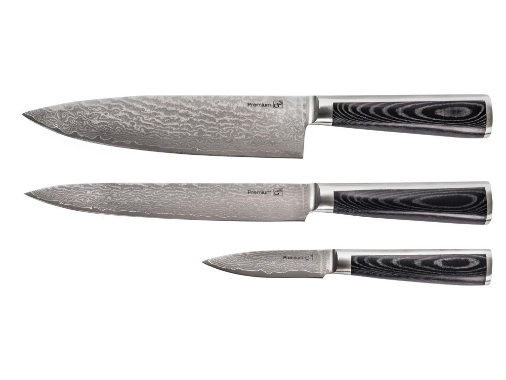 Súprava nožov z damaškovej ocele v kuchyni je skvelou voľbou. Damascénska ocel má vyššiu tvrdosť a odolnosť proti opotrebovaniu a vďaka vzácnemu a jedinečnému vzoru ocele získate aj jedinečnú kombináciu krásy a luxusu s vynikajúcimi reznými vlastnosťami. V súprave nájdete kuchynský nôž, plátkovací nôž s dĺžkou 20 cm a úžitkový nôž s dĺžkou čepele 9 cm, ako aj bambusový blok na bezpečné uloženie nožov a brúsny kameň so zrnitosťou 1000/3000. Prémiová kvalita spracovania a dizajn Súpravu nožov G21 Damascus Premium z damascénskej ocele používajte na krájanie a rezanie. Je ideálna aj ako darček. Čepeľ noža je vyrobená z kvalitnej 67-vrstvovej damascénskej ocele VG-10 s tvrdosťou 60 HRC (pri bežných nožoch sa tvrdosť pohybuje okolo 55 HRC, skutočne ostré nože majú tvrdosť 58 – 60 HRC). Čepele nožov sú teda veľmi odolné, majú vysokú stabilitu a neuveriteľne dlhú životnosť. Vrstvená damascénska ocel sa používala aj na výrobu zbraní alebo mečov. Súprava troch nožov G21 Damascus Premium v bambusovom bloku s brúsnym kamenom. Bambusový blok na bezpečné a šetrné skladovanie nožov Designový stojan na nože je vyrobený z ekologického bambusového dreva. Drevo je najlepší materiál na skladovanie nožov. Čepele nožov sa pri posúvaní po dreve netupia ako pri iných tvrdších materiáloch. Každý nôž má v stojane svoje bezpečné miesto. Správna starostlivosť o nože a ich uloženie v špeciálnom drevenom bloku predĺži životnosť nožov. Oboustranný brúsny kameň Vedeli ste, že pri varení sa najčastejšie porazíte tupým nožom? Dokonale ostrý nôž je v kuchyni polovica úspechu. Je to nevyhnutná súčasť výbavy každého amatérskeho aj profesionálneho kuchara. Obojstranný brúsny kameň G21 so zrnitosťou 1 000/3 000 vám umožní dokonale nabrúsiť všetky druhy kuchynských nožov vrátane damaškových. Brusný kameň G21 je určený na ostrénie pomocou vody. Jadro brúsky je vyrobené z odolného tvrdého cementu. Brusný povrch, směs karborunda a diamantu, robí z brúsky G21 univerzálny, vysokokvalitný ostriaci kameň s vynikajúcou tvrdosťou. TIP: Nikdy sa nepokúšajte brúsiť nože suchým brúskom, vždy ho najprv namočte do vody. Pridaním vody počas ostrenia vymyjete z pórov brúsneho kameňa abrazívne častice a zachováte jeho ostriaci účinok. Súprava piatich nožov G21 Damascus Premium z damascénskej ocele. Výhody damascénskych nožov Damašková ocel sa skladá z dvoch alebo viacerých rôznych ocelí, ktoré sú spojené do jedného celku. Výsledkom je materiál, ktorý je odolný proti opotrebovaniu a zároveň proti zlomeniu. Vďaka použitému materiálu je čepeľ noža G21 Damascus Premium ostrá, odolná, pevná a pri správnej starostlivosti vám bude slúžiť desaťročia. Kuchynské nože G21 s čepeľou z damascénskej ocele sa vyrábajú technológiou práškovej metalurgie, pri ktorej sa na základný kov (v tomto prípade ocel VG-10) nanášajú vrstvy a postupne sa spájajú. Rozdielne zloženie týchto vrstiev spôsobuje ich rozdielne sfarbenie. Dôležitá je aj kvalita rukoväte Rukoväť je vyrobená z extrémne pevného a odolného laminátového materiálu Micarta. Micarta sa skladá z plátna alebo sklenej tkaniny s termostatickou živicou. Výsledkom je pevná a odolná rukoväť, ktorá nepodľahne zubu času. Hladké, rovné a čisté línie týchto nožov sa stanú ozdobou každej kuchyne. Predĺžená záruka 2 + 2 roky Na kvalitu tohto výrobku poskytujeme záruku 4 roky. K štandardnej 2-ročnej záručnej dobe získate registráciou na http://g21-warranty.com ďalšie predĺženie záruky o 2 roky. Využijte túto možnosť a zaregistrujte sa po zakúpení. Predĺžená záruka 2 + 2 roky sa vám oplatí! Predĺžená záruka 2 + 2 roky sa oplatí! Špecifikácia Model. Určenie: kuchynské nože Dĺžka čepele Kuchařský nôž 20 cm Nôž na krájanie 20 cm Úžitkový nôž 9 cm Iné Materiál: 67-vrstvová damašková ocel VG-10 Test tvrdosti podľa Rockwella: 60 HRC Materiál rukoväte: Micarta Záruka: 2 + 2 30 x 30 cm Hmotnosť balenia: 2,8 kg Certifikácia: LFGB Obsah balenia Súprava nožov G21 Damascus Premium 3 ks Bambusový blok Brusný kameňDodatočné parametre