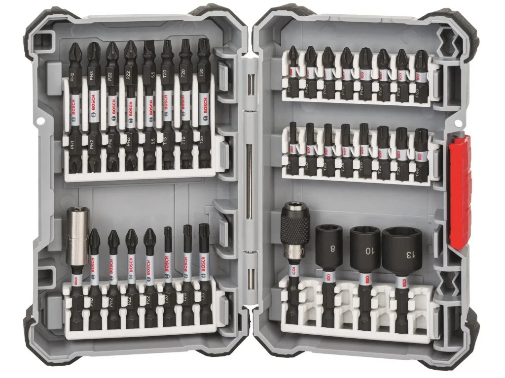 Súprava skrutkovacích bitov PRO Impact, 6 × 36 ks, s boxom Šróbovací bit 25 mm: PH1; PH2 (3×); PH3 PZ2 (2×); PZ3 T15; T20 (2×); T25 (2×); T30 (2×); T40 Šróbovací bit 55 mm: PH2 (2×) PZ2 (2×) T20; T25; T30 Šróbovací bit 65 mm: PH1/PH2; PH2/PH3; PH2/PZ2 (2×) T15/T20 (2×); T25/T30 SL1 x 5,5/SL1 x 5,5 Nástrčný kľúč 50 mm: 8; 10; 13 mm Držiak bitov 60 mm: Držiak bitov: štandardný držiak bitov Rýchlovýmenný držiak bitov Typ balenia Plastový obal, kazeta, s eurootvorom na zavesenie Obsah balenia 36 ks Veľkoobchodné balenie 6 ksDodatočné parametre