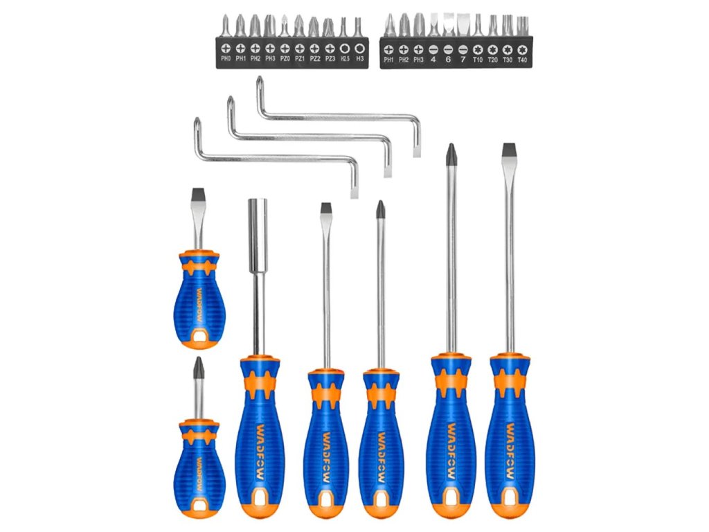 Súprava 30 skrutkovačov Materiál: CR-V 1 ks magnetický skrutkovač so stopkou 1/4" 100 mm 20 ks skrutkovačov c-rv 4 25 mm: SL3 SL4 SL5 SL6 SL6 PH0 PH1 PH2 PH3 75 mm 1 ks skrutkovač PH2 38 mm 1 ks skrutkovač PH2 100 mm 1 ks skrutkovač SL5,5 75 mm 1 ks skrutkovač SL6,5 1 ks skrutkovač SL6,5 100 mm 3 ks dvojcestný skrutkovač v tvare Z: SL3 PH2;Dodatočné parametre