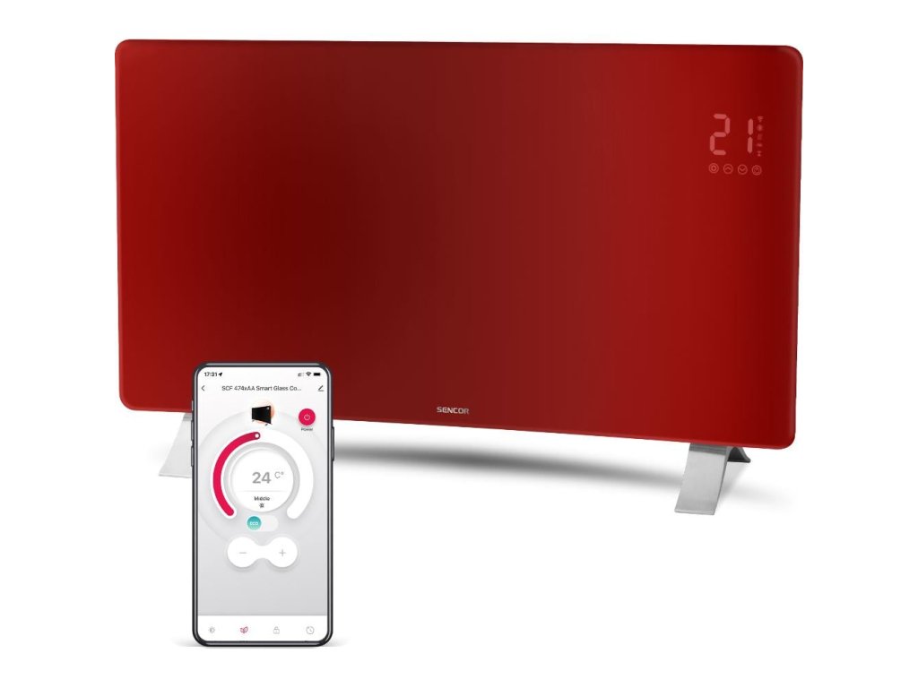 Inteligentný sklenený konvektor Wi-Fi Sencor SCF 4742RD Ovládanie pomocou aplikácie Sencor HOME (iOS / Android) Výkon 2 400 W Priehľadný konkávny zakrivený sklenený povrch 2 nastavenie ohrevu (nízky výkon 1 200 W / vysoký výkon 2-400 W) Nastavenie teploty 5 pohodlie počas noci Funkcia stmievania displeja 24-hodinový časovač a týždenný program 7/24 Na použitie ako volne stojící alebo nástenný Hliníkové nožičky a nástenné držiaky Funkcia detekcie otvoreného okna Stupeň krytia IP24 - vhodné do kúpeľní Bezpečnostná poistka proti prehriatiu Bezpečnost 10,5 × 47,5 cm Hmotnosť 10,5 kg Farba červenáDodatočné parametre