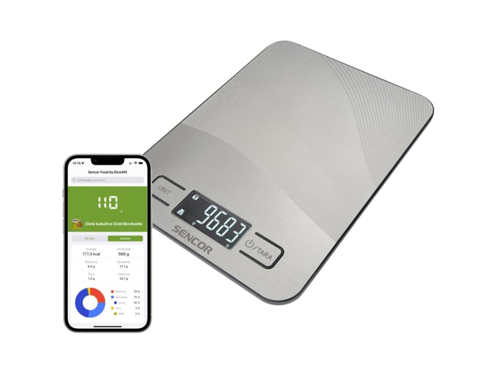 Inteligentná kuchyňská váha SENCOR SKS 8080 Aplikácia Sencor FOOD vytvorená v spolupráci s tvorcami aplikácií Kalorické tabuľky Bohatá online databáza potravín Načítanie EAN kódov potravín v aplikácii Viac ako 400 000 priebežne aktualizovaných položiek Poskytuje nutričné údaje pre požadovaný príjem potravín podsvietený LCD displej Kapacita váženia do 10 kg/d = 1 g 2x 1,5 V batéria AAADodatočné parametre