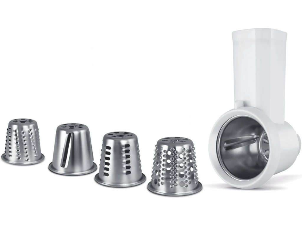 Príslušenstvo pre kuchynský robot Sencor STM 7900. Nerezový krájač a strúhadlo na ovocie a zeleninu. Dokáže krájať, rezať a strúhať, 5 kusov vymeniteľného príslušenstva zaručuje dokonalé pracovné výsledky.Dodatočné parametre