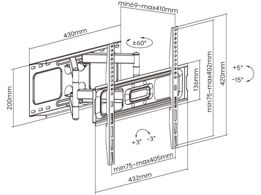 Výsuvný nastaviteľný držiak TV STELL SHO 5610 Min. uhlopriečka obrazovky: 32" Maximálna uhlopriečka obrazovky: 70" Náklon hore: +5° Náklon dolov: -15° Náklon: +/-60° Otáčanie: +/-3° Min. vzdialenosť od steny: 6,9 cm Maximálna vzdialenosť od steny: 41 cm Maximálna nosnosť: 45 kg Šírka: 432 mm Výška: 420 mm Hĺbka: 410 mm Minimálna vzdialenosť: 75x75 mm Maximálna rozteč: 405x402 mm VESA 100x150 VESA 100x200 VESA 150x100 VESA 150x150 VESA 200x100 VESA 200x200 VESA 300x200 VESA 300x300 VESA 400x20 400x400 Farba: čierna Materiál: ocel Vedenie káblovDodatočné parametre