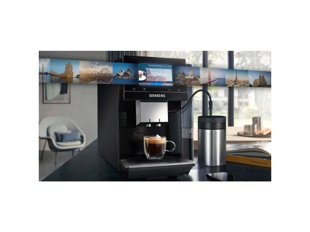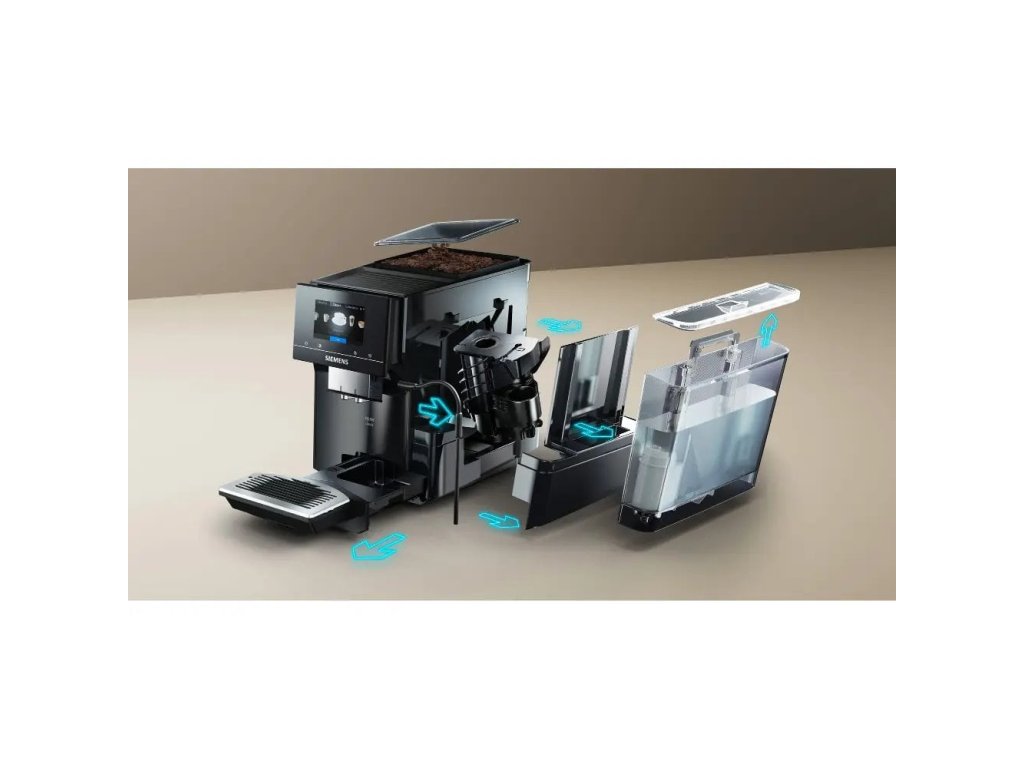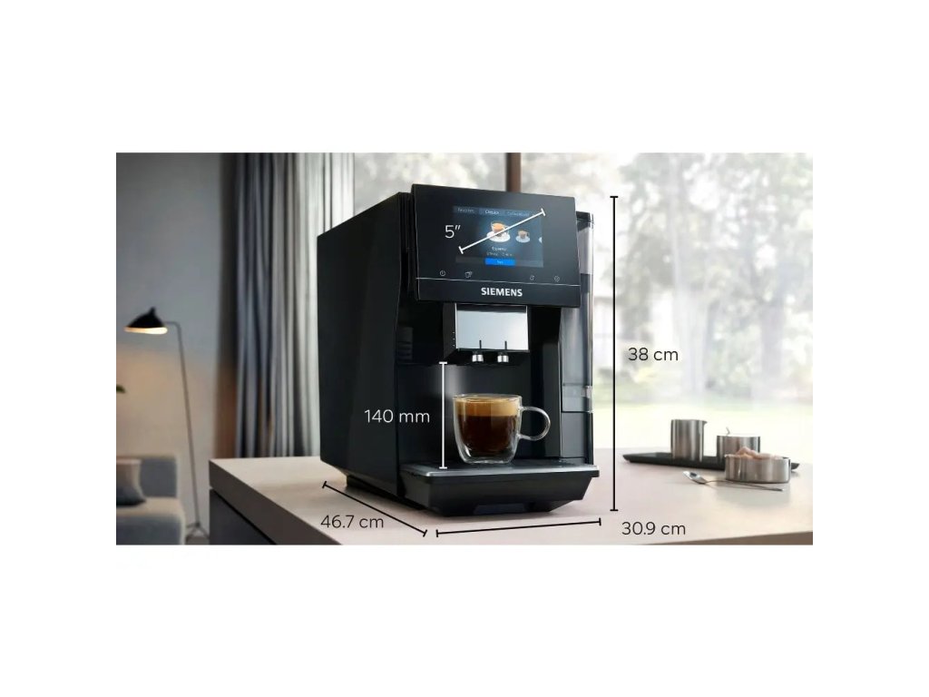 Vychutnajte si čerstvú kávu a neodolateľnú arómu priamo u vás doma s plne automatickým kávovarom Siemens TP713R09 s výkonom 1 500 W, profesionálnym tlakom 19 barov a precíznym mletím obľúbených zŕn v keramickom mlynčeku CeramDrive. Kombinácia kvalitného mlynčeka, inteligentného ohrievača, inteligentného vodného čerpadla a špičkovej sparovacej jednotky vytvára dokonalú súhru chutí a vôní. Všetko je dokonale integrované s funkciou iAroma vo vnútri kávovaru na dosiahnutie najlepšej chuti vašej kávy.