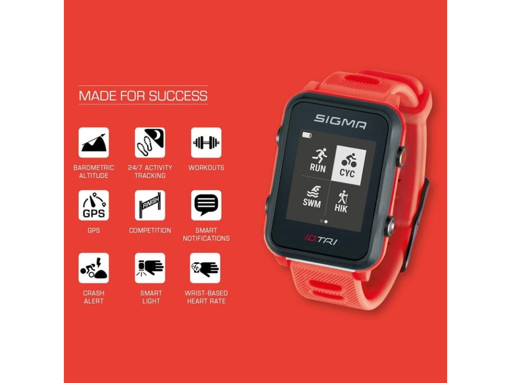 Sigma iD.TRI Set Je triatlon vaša vášeň? Potom potrebujete iD.TRI! S modelom iD.TRI ponúka SIGMA triatlonistom inovatívne športové hodinky pre tréning aj preteky. Jednoduché, intuitívne ovládanie, ako aj chytré funkcie a špeciálne príslušenstvo urobia radosť nielen začiatočníkom, ale aj skúseným triatlonistom. Vďaka Bluetooth, ANT+ a USB rozhraniu je možné hodinky iD.TRI prepojiť so smartfónom, počítačom aj externými snímačmi. Okrem toho nie sú hodinky iD.TRI len spoľahlivým partnerom pre triatlon, ale vďaka funkcii záznamu aktivít a analýze spánku sú vhodné aj na každodenné použitie. Premyslený tréningový systém hodiniek iD.TRI meria vďaka špeciálnym algoritmom v jednotlivých disciplínach všetky hodnoty, ktoré sú pre triatlonistov relevantné. Nastavenie a tréningové náhľady športových profilov je možné na hodinkách individuálne upravovať. Rovnako cielene je možné na základe rôznych parametrov nastavovať cieľové zóny a tréningy, ktoré je možné vyhodnocovať a analyzovať pomocou softvérových nástrojov SIGMA. Aby sa triatlonisti mohli optimálne pripraviť na preteky a absolvovali ich bez stresu, ponúkajú hodinky iD.TRI závodný režim. V plánovači pretekov je tak možné ľubovoľne voliť poradie a vzdialenosť disciplín tak, aby bolo možné okrem bežných vzdialeností vytvárať aj ďalšie preteky, ako sú napr. duatlony. Počas pretekov hodinky merajú aj celkový čas prechodu medzi jednotlivými disciplínami. Okrem toho si triatlonisti môžu nastaviť upozornenie na doplnenie energie a tekutín po uplynutí stanoveného času alebo vzdialenosti. Jednoduchá štruktúra menu a ovládanie pomocou štyroch tlačidiel sú zárukou ľahkého ovládania hodiniek iD.TRI. Vzhľadom k tenkej a ľahkej konštrukcii je možné hodinky iD.TRI nosiť pod každým neoprénovým oblekom a vďaka vodotesnosti do 5 ATM sa optimálne hodia na plávanie. Tieto triatlonové GPS hodinky navyše zaujmú prvotriednymi materiálmi, z ktorých sú vyrobené, a vymeniteľnými remienkami zo silikónu. Hodinky sú vybavené najmodernejšou technikou a ponúkajú presné a rozsiahle merané hodnoty. Ponúka GPS meranie, trojosový kompas, čidlo zrýchlenia a barometrické meranie výšky. Na účely merania tepu sú hodinky vybavené kvalitným PPG senzorom, ktoré meria tepovú frekvenciu pohodlne zo zápästia. Prípadne je možné na dosiahnutie presnosti porovnateľnej s EKG pripojiť aj hrudný pás. Pre triatlonistov je obzvlášť praktický šikovný držiak na riadidlá Snap On Bike Mount. Umožňuje ľahko a rýchlo pripevniť hodinky iD.TRI na riadidlá aj v priebehu závodu, vďaka čomu má pretekár počas jazdy prehľad o všetkých dôležitých hodnotách. Hodinky iD.TRI sa vďaka jedinečným funkciám postarajú o mimoriadny športový zážitok. Funkcia Smart Light zjednodušuje inovatívnym spôsobom tréningový zážitok triatlonistov tým, že svetelnými signálmi podporuje tréning v cieľovej zóne a zobrazuje pokyny na odbočovanie a múdra upozornenie Smart Notifications. Funkcia Crash Alert prispieva k bezpečnosti počas tréningu tým, že pri rozpoznanom páde odošle SMS správu na uvedený kontakt pre núdzové situácie. Aby používateľ vždy dorazil do cieľa, ponúkajú hodinky iD.TRI navigáciu prostredníctvom trasovej navigácie a populárnej aplikácie pre peších a cyklistické trasy komoot. Trasy je možné do GPS triatlonových hodiniek načítať cez Sigma DATA CENTER alebo pomocou aplikácie Sigma LINK. V rámci navigácie prostredníctvom aplikácie komoot sa zobrazujú upozornenia na odbočenie priamo na displeji hodiniek, a smartphone tak môže zostať vo vrecku. Vďaka USB rozhraniu a Bluetooth komunikujú hodinky iD.TRI s PC a chytrým telefónom. Pre konfiguráciu tréningových náhľadov, ako aj profesionálne vyhodnocovanie a analýzu dát je triatlonistom k dispozícii dátové centrum Sigma DATA CENTER a aplikácia Sigma LINK. Obsah balenia iD.TRI Vysielač rýchlosti a kadencie R2 Duo Combo Vysielač tepovej frekvencie R1 Duo Comfortex+ Držiak na bicykel SnapOn Bike Mount Nabíjací kábel Voucher navigácia komoot región Funkcia tepovej frekvencie Tepová frekvencia Maximálna tepová Priemerná tepová maximálna tepová frekvencia Kalórie Indikátor zón % tréningového času v jednotlivých zónach Čas v cieľovej zóne Cieľová zóna s indikátorom zón Alarm zón Prednastavené tréningové zóny Rýchly prístup k aktuaniu tepovej frekvencie Priemerná tepová frekvencia na okruh Maximálna tepová frekvencia na okruh Rýchlosť/vzdialenosť Aktuálna rýchlosť Priemerná rýchlosť Priemerná rýchlosť na okruh Celkové kilometre Maximálna rýchlosť Dĺžka okruhu Funkcia navigácie Navigácia po trase Komoot navigácia Funkcia Geocaching Prednačítanie satelitných dát pre rýchly štart tréningu Funkcia času Hodiny Dátum Tréningový čas Aktuálny čas okruhu Bud posledného okruhu kalórie Sledovanie aktivít - kroky Definované priebežné ciele (bronz, striebro, zlato) Individuálny denný cieľ (kroky) Analýza spánku Sledovanie kvality spánku Sledovanie jednotlivých fáz spánku Funkcia pre beh Aktuálnych frekvencií krokov Priemerná frekvencia krokov Frekvencia krokov Aktuálna dĺžka kroku Funkcia jazdnéhoozpoznanie plaveckého štýlu Počet bazénov Počet temp (záberov) na bazén Funkcia lyžovania Počet výjazdov a zjazdov Konektivita Kompatibilný s aplikáciou SIGMA LINK cez Bluetooth Kompatibilný s aplikáciou DATA CENTER cez USB Smart notifikácie Zasielanie informácií o núdzovej situácii Vlastnosti zariadenia Meranie tepovej frekvencie s maximálnou frekvenciou okruhu Automatický stop Podsvietenie displeja Displej krytý minerálnym sklom Mesačná tréningová štatistika Osobné rekordy Meranie tepu zo zápästia Počítadlo okruhov Silikónový remienok (užívateľsky vymeniteľný) 4 predna