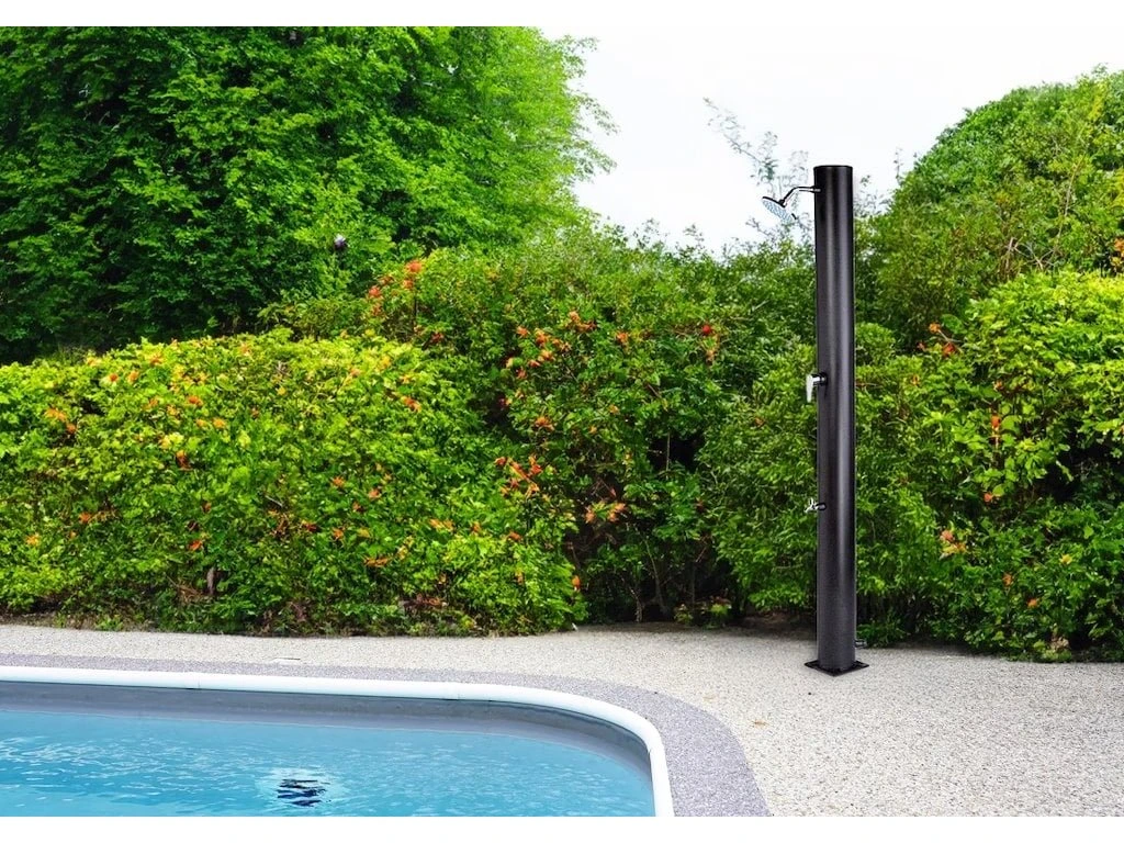 Záhradná sprcha UNO s nevídaným objemom 35 l na vonkajšie použitie. Zabezpečuje ohrev vody privádzanej zo záhradnej hadice, a tým dokonalý pocit pohodlia pri sprchovaní teplou alebo vlažnou vodou. Voda sa ohria slnečným žiarením a telesom sprchy, ktoré funguje ako solárny kolektor. Na sprchovanie musí byť záhradná sprcha stále pripojená k prívodu vody. Ak nie je pripojená, sprchovanie nie je možné. Okrem toho je sprcha vybavená samostatným kohoutkom vo výške kolen na oplachovanie nohou. do tohto kohoutku ide voda priamo z hadice, netečie z neho žiadna teplá voda. Horná sprchová hlavica je vybavená závesom, a tak sa dá polohovať rôznymi smermi. Sprcha je pevne ukotvená do zeme pomocou 4 skrutiek (nie sú súčasťou dodávky), čím je zabezpečená ho dokonalá stabilita. Výtokový ventil sa nachádza na bočnej strane sprchy. Sprcha je vybavená ventilom na nastavenie teploty výstupnej vody. S ohľadom na teplotu vody vo vnútri sprchy, ktorá môže dosahovať až 60 °C, sa odporúča najprv otočiť ventil doprava, otočiť ho smerom od tela sprchy, aby sa uvolnila studená voda, a potom otočením ventilu doľava nastaviť vodu na požadovanú teplotu. Zo spodného kohoutku tečie ľan studená voda. Sprcha je celá plastová, iba kohout je kovový. Maximálny prípustný tlak vody na vstupe do batérie: 3 bary Minimálny požadovaný tlak: 2 bary Výška: 210 cm (bez sprchovej hlavice) Hmotnosť výrobku Čistá hmotnosť: 9 kg Kotviaca spodná deska: 4 x 9 mm otvory s rozstupom 145x145 mm Obsah balenia sprchové teleso s namontovaným rýchlospojka návod na použitie a montážDodatočné parametre