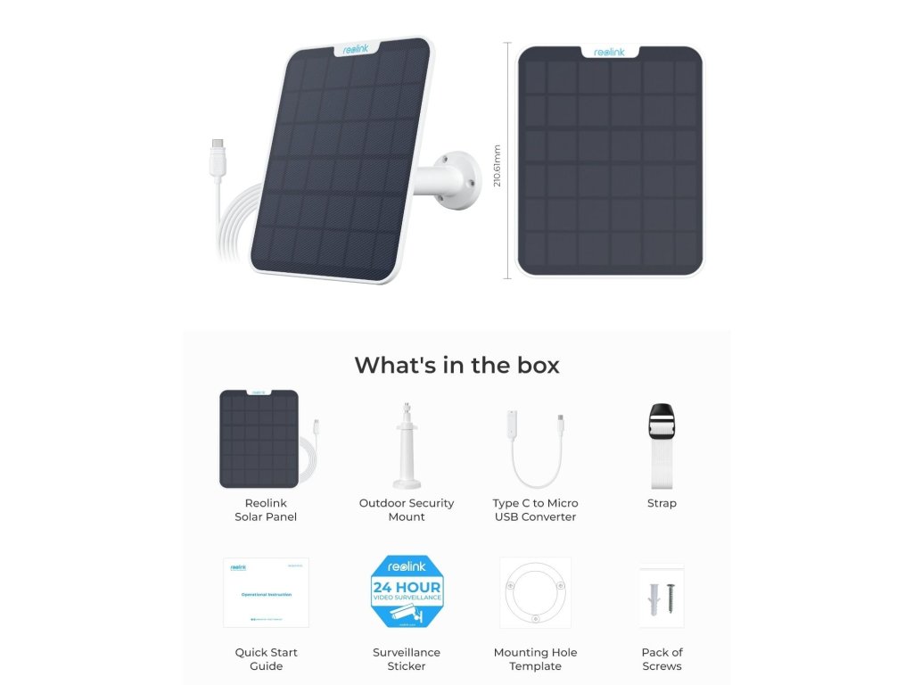 Solárny panel Reolink udržuje fotoaparát nabitý aj bez napájania z elektrickej siete. Solárny panel možno pripojiť ku kamere pomocou dodaného štvormetrového napájacieho kábla. Konektor na paneli je moderný konektor USB-C, ktorý vám zaručí ešte efektívnejšie nabíjanie. Nástenný držiak, ktorý sa môže otáčať o 360 °, uľahčí presné nasmerovanie solárneho panelu a maximalizuje dopadajúce slnečné svetlo. Panel je vhodný do všetkých poveternostných podmienok. Kompatibilný so všetkými batériovými kamerami Reolink: Argus 3 2K, Argus 3 Pro, Reolink Go, Reolink Go Plus, Reolink Go PT, Reolink Go PT Plus, Argus PT Ultra, Argus 2, Argus Eco, Argus 2E, Argus Pro, Argus PT 2K, Reolink Duo 4G, Reolink Duo 2 LTE, Reolink Trackmix, Reolink Trackmix LTE, Reolink Duo 2, Reolink Duo 2 LTE, Argus PT Ultra. Špecifikácia Prevádzková účinnosť: 19,5 %. Maximálny nabíjací výkon: 6 W. Maximálne napätie: 6 V. Maximálny napájací preud: 960 mA. Stupeň ochrany: IP65. Rozmery panela: 210 mm x 175 mm x 6 mm (vx š xh). Obsah balenia: Solárny panel. 4 m napájací kábel. Vonkajší bezpečnostný držiak. Napájací popruh. Kabel USB-C na Micro USB. Návod na použitie. Kapsa so skrutkami. Montážna šablona. Značkový hľadáčik na video.Dodatočné parametre
