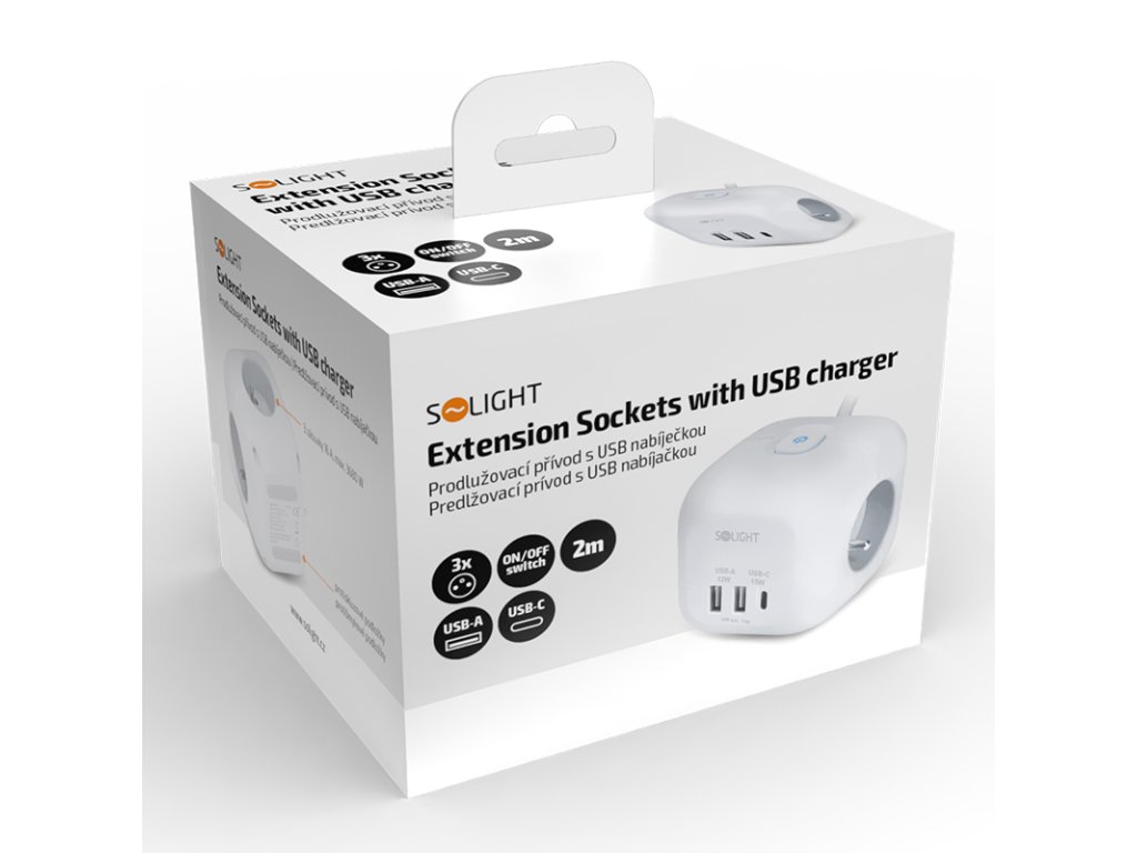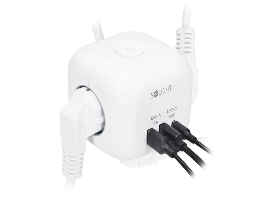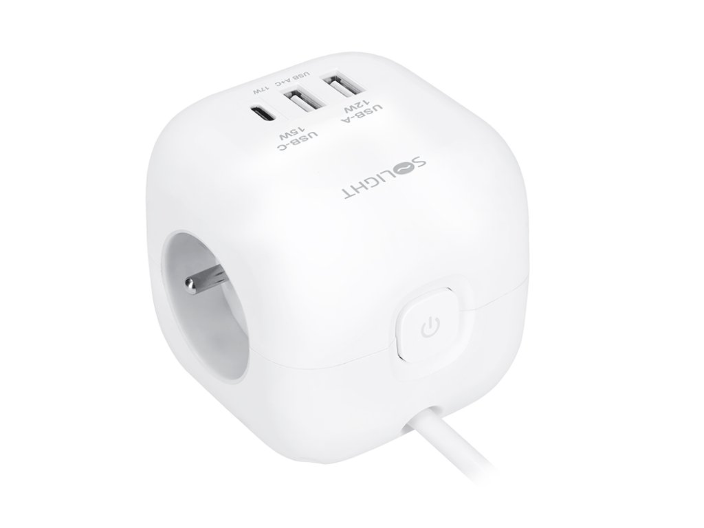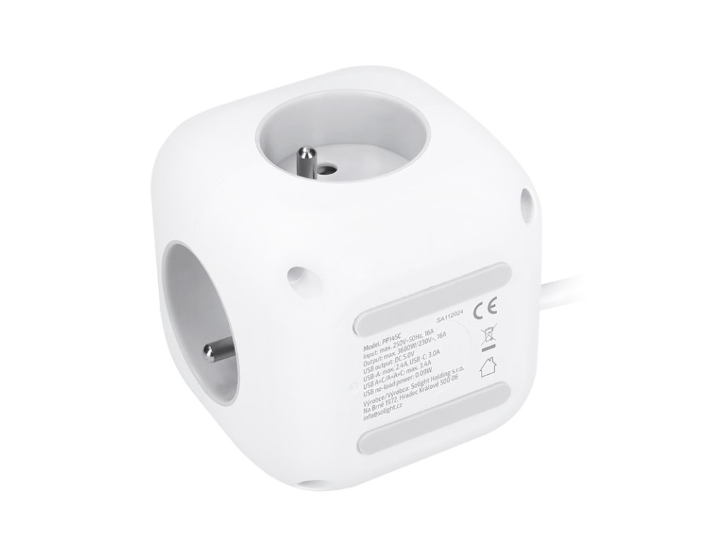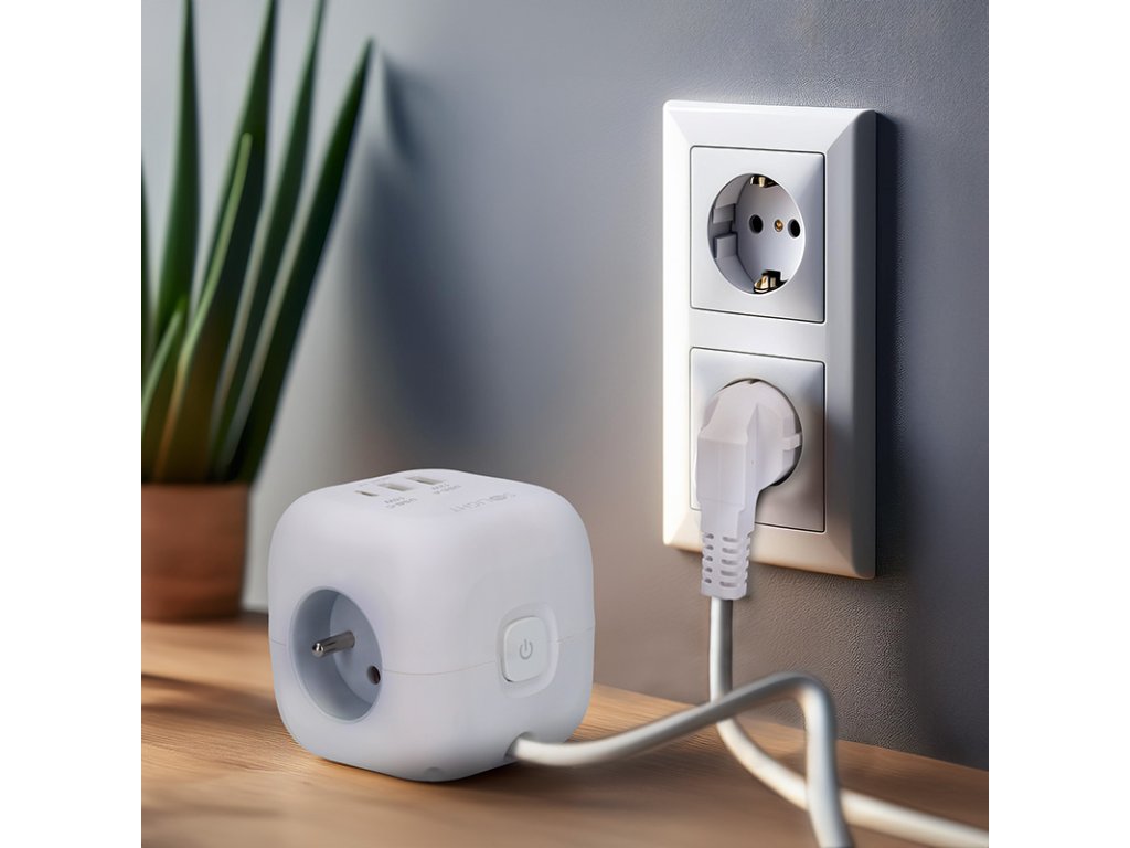 Kompaktný dizajn a jednoduché používanie Predlžovací kábel v tvare kostky s dĺžkou strany 8 cm spája tri uzemnené zásuvky s dětskou poistkou a nabíjačku USB s portami USB-C a USB-A. Vďaka 2 m dlhému káblu poskytuje flexibilné použitie. Vďaka protišmykovým podložkám je kábel stabilný na stole alebo pracovnej ploche. Osvetlený vypínač umožňuje jednoduché ovládanie všetkých zásuviek a portov USB. Inteligentné usporiadanie a moderný dizajn Dômyselné rozmiestnenie zásuviek uľahčuje pripojenie rôznych napájacích káblov a objemných napájacích adaptérov bez vzájomného rušenia. Elegantný dizajn kostky so zaoblenými hranami, bielym telom a šedými zásuvkami sa hodí do každého prostredia – či už ide o kanceláriu, domácnosť alebo dielňu. Bezpečnosť a výkon Tri štandardné 230V zásuvky s dětskými poistkami poskytujú maximálnu ochranu a zvládnu záťaž až do 3680 W pri 230 V~/16 A. Kombinácia portov USB-A a USB-C umožňuje flexibilné použitie na nabíjanie väčšiny dostupných zariadení. Odolnosť a dlhá životnosť Kvalitná konštrukcia z odolného plastu ABS zaručuje dlhú životnosť a bezpečnosť. Protismykové podložky minimalizujú nežiaduce pohyby na pracovnej ploche. Ideálna voľba na každodenné používanie a elegantný doplnok moderných interiérov. Typ zásuvky: 3x 230V/16A, max. 3680W, detské poistky 1x USB-C, 5V/3,0A, max. 15W 2x USB-A, 5V/2,4A, max. 12W Podsvietený vypínač ovláda zásuvky 230V aj USB protišmykové podložky PVC kábel 2 m, H05VV-F, 3 x 1,0 mm2, šikmá vidlica farba biela, zásuvky v šedej barveDodatočné parametre