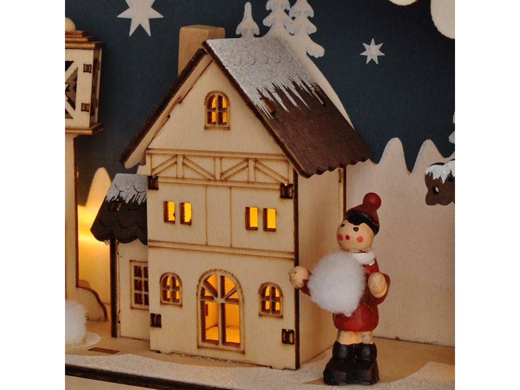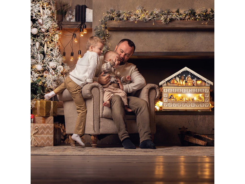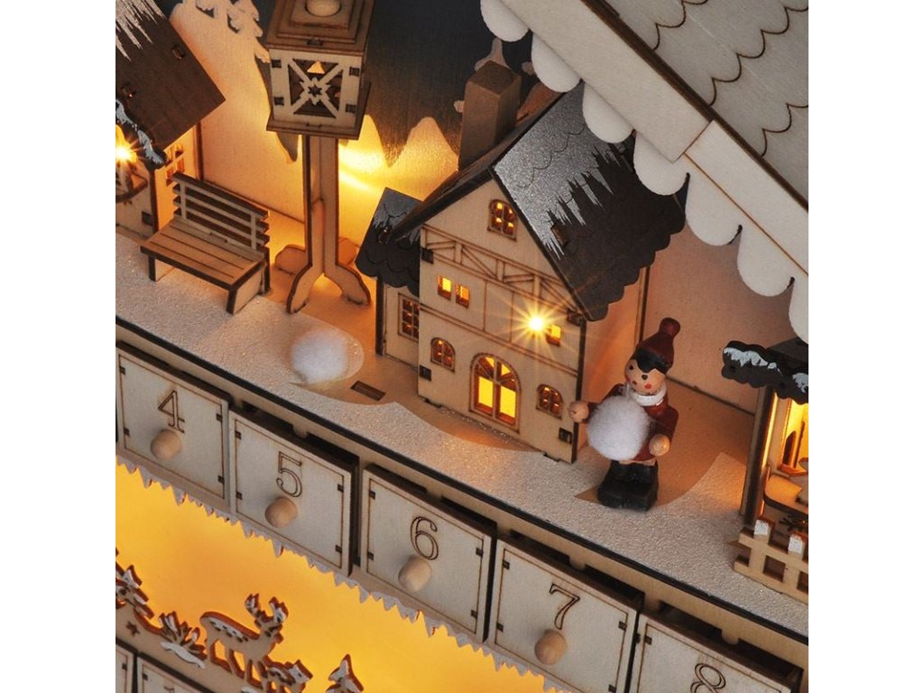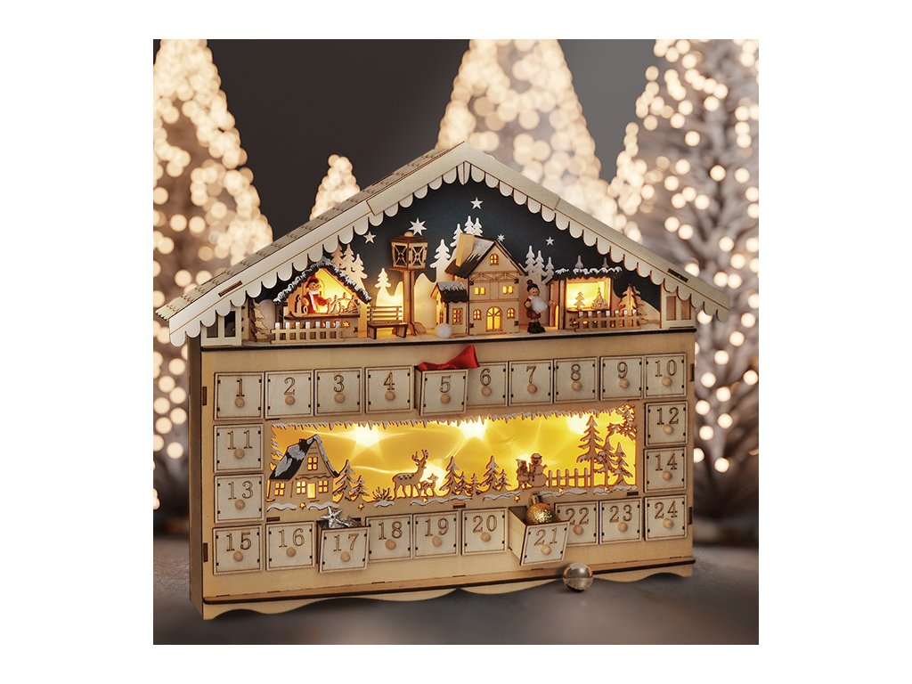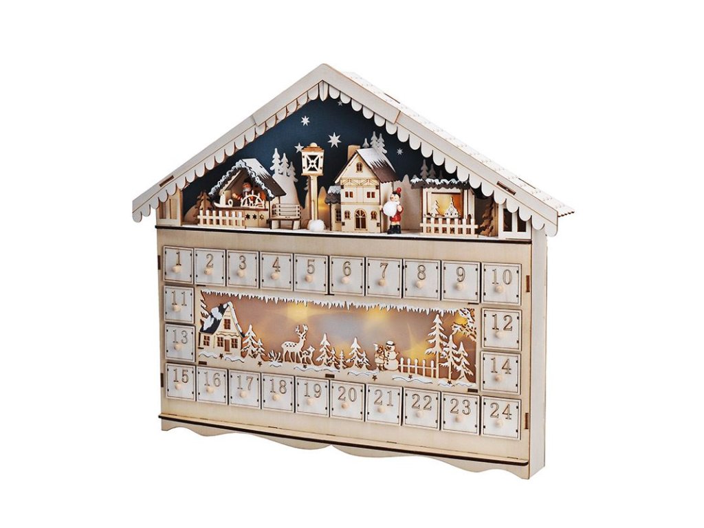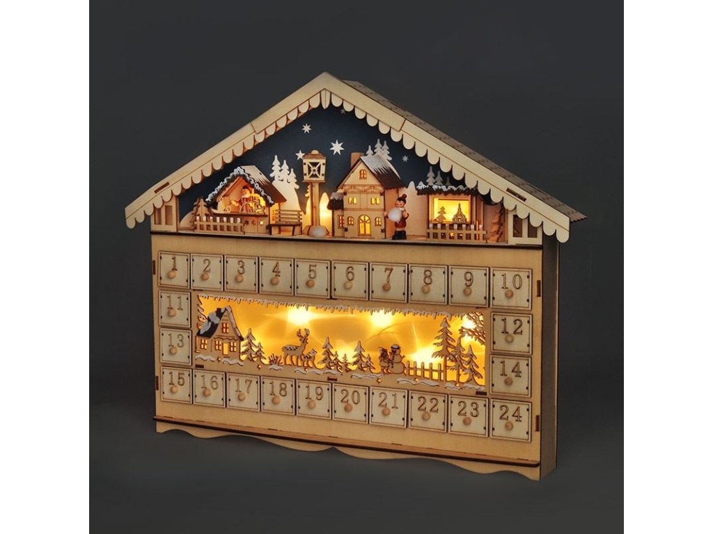 LED adventný kalendár v tvare horskej chaty Počet LED diód: 10 farba svetla: teplá biela napájanie: 2x batérie AA (nie sú súčasťou balenia) Trieda ochrany: IP20 (použitie v interiéri) rozmery kalendára: 50 x 40 x 6 cm materiál: drevo farba: hnedáDodatočné parametre