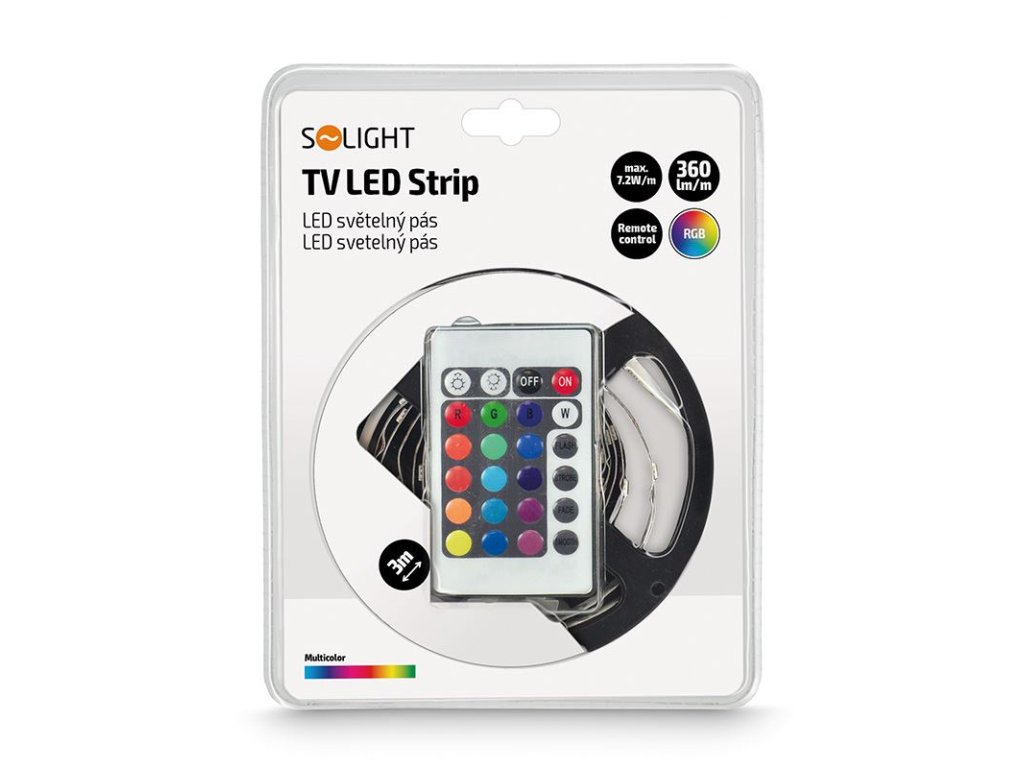 Solight LED svetelný pás, RGB, 3 m, sada s 12V adaptérom a diaľkovým ovládaním, 7,2 W/m, IP20