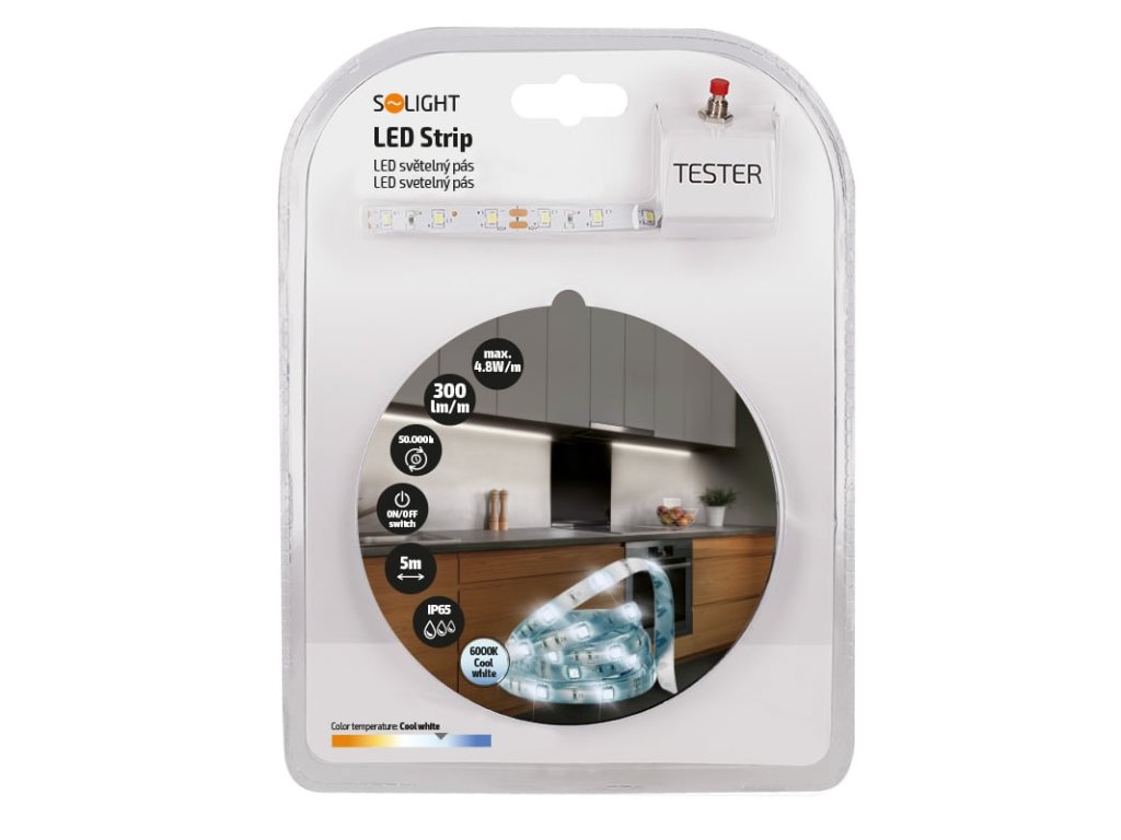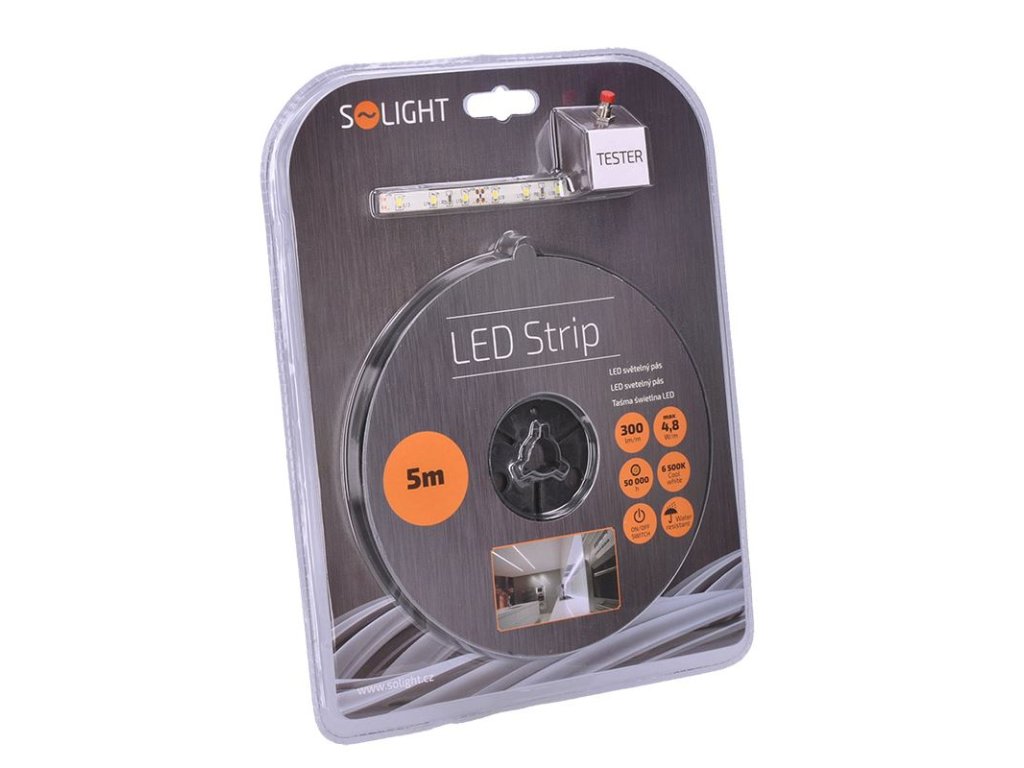 Solight LED svetelný pás s testerom, 5 m, sada s adaptérom 12V, 4,8 W/m, IP65, studená biela