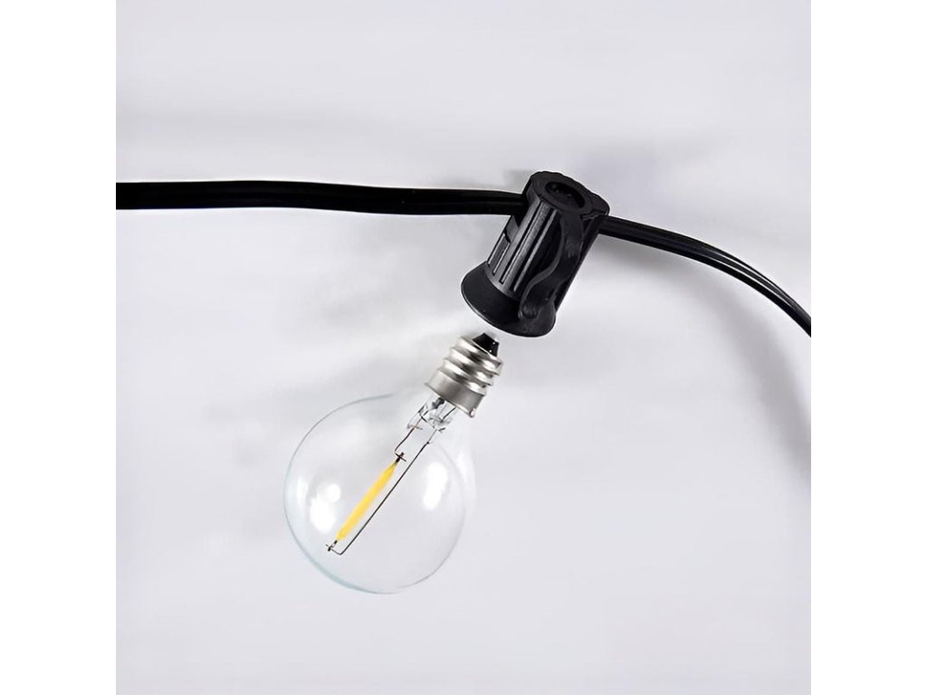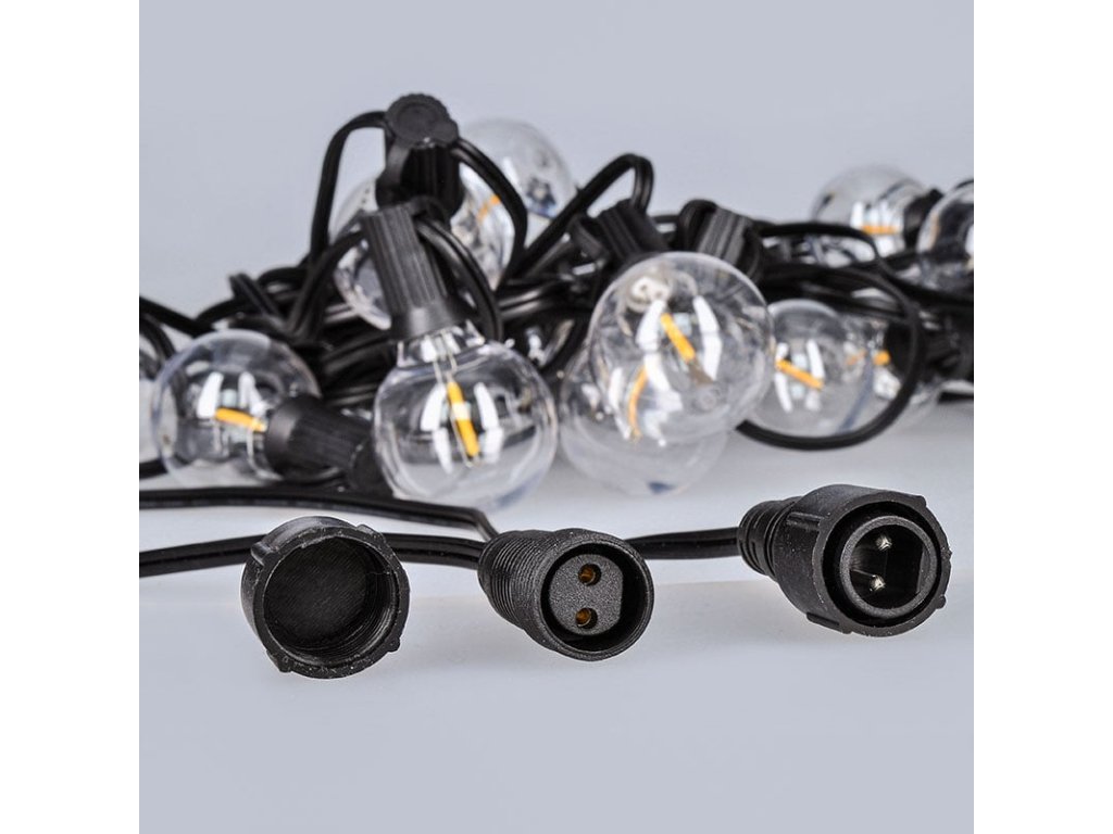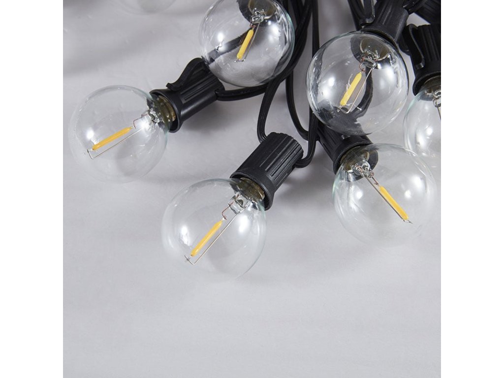 Stylový LED venkovní řetěz s vyměnitelnými G40 žárovkami přináší příjemnou atmosféru do každého exteriéru i interiéru. Řetěz obsahuje 10 LED žárovek s paticí E12, přičemž každá z nich poskytuje teplé bílé světlo (3000K) s intenzitou 50 lm. Celkový příkon činí 6 W a světelný tok dosahuje 750 lm, což zajistí decentní, ale dostatečné osvětlení například pro zahradní posezení, pergolu nebo terasu.Osvětlená délka řetězu je 5 metrů, přívodní kabel měří 3 metry a celková délka tak činí 8 metrů. Žárovky jsou rozmístěny ve vzdálenostech 55 cm a celý řetěz je možné propojit až se dvěma dalšími kusy (max. 3 ks). Díky krytí IP44 je vhodný pro venkovní i vnitřní použití, a odolá vlhkosti i mírnému dešti. Žárovky jsou demontovatelné a v balení jsou navíc 2 náhradní kusy. Ideální volba pro večerní relaxaci i slavnostní dekoraci.