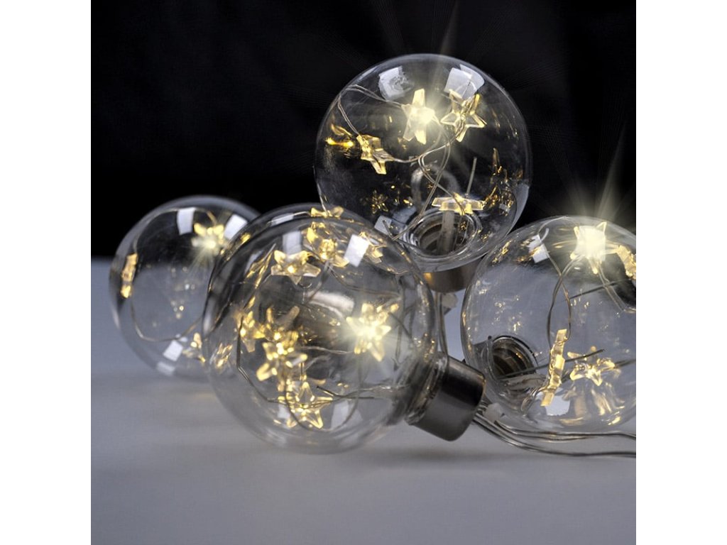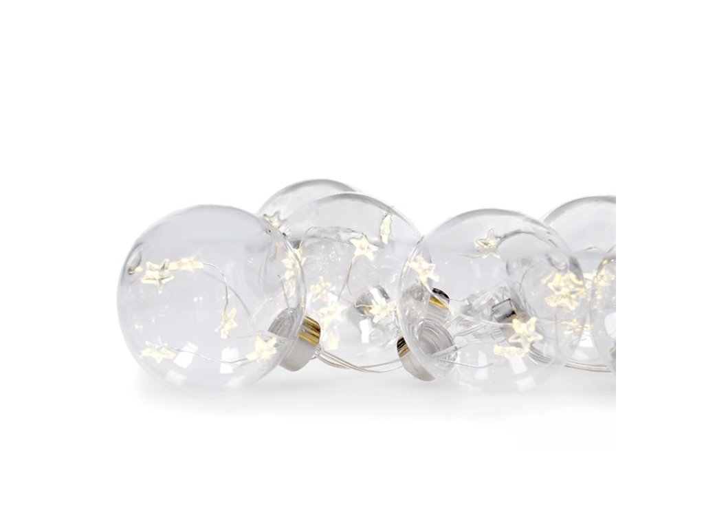 LED vianočná guľa so svietiacimi hviezdami Počet vianočných gúľ: 6 Počet hviezdičiek v guli: 5 Celkový počet LED diód: 30 priemer jednej gule: 8 cm dĺžka svietiaceho kábla: 2 m dĺžka prívodného kábla: 0,5 m farba svetla: teplá biela (žltá) časovač 6h/18h - automaticky sa vypne po 6 hodinách od zapnutia a znovu sa zapne po 18 hodinách možnosť manuálneho vypnutia a zapnutia (bez časovača) napájanie: 3x batérie AA (nie sú súčasťou dodávky) životnosť batérií: približne 80 hodín (v závislosti od kvality batérií) stupeň ochrany: IP20 (použitie v interiéri) farba: priehľadná balenie: farebná krabička s testovacím tlačidlom vybitie batérie v testovacom tlačidle nie je dôvodom na reklamáciuDodatočné parametre