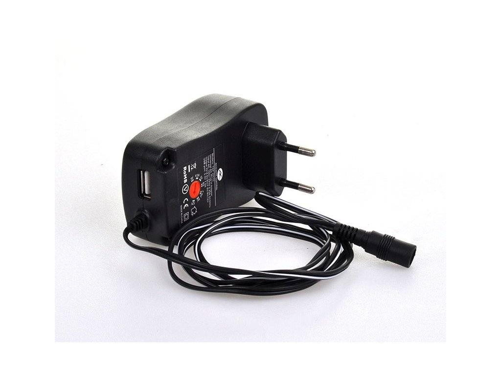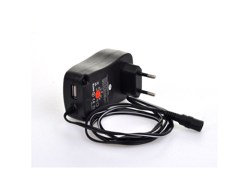 pulzné, stabilizované vstupné napätie: 100 - 250 V, 50/60 Hz výstupné napätie: 3/4,5/5/6/7,5/9/12V Výstupný preud: max. 2500 mA DC Výstupný výkon: max. 30 W Pohotovostný výkon: za, 30% pri nulovom zaťažení: až 95 % Výstup USB: 5V/1A sada vymeniteľných konektorov DC 1) 2,35 x 0,7 mmDodatočné parametre