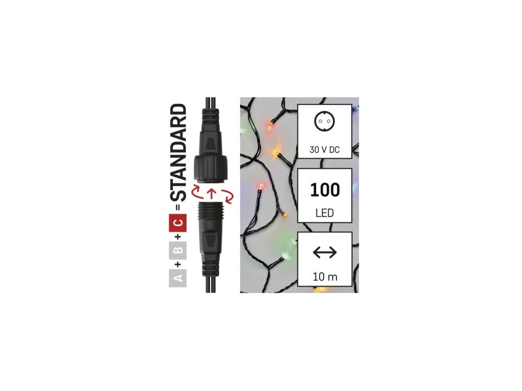 Štandardná spojovacia vianočná reťaz LED, 10 m, vnútorná a vonkajšia, viacfarebná