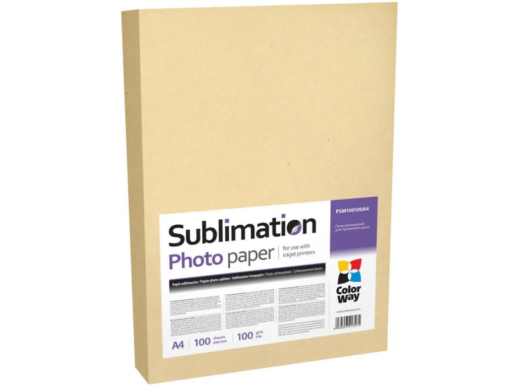 Sublimačné foto ColorWay A4 100 ks Sublimačný fotografický papier určený pre inkoustové tlačiarne. Odporúčané parametre pre úspešnú sublimáciu: Tlačte na hrubšiu stranu papiera. Polyester: 190 °C, 80 sekúnd (materiál musí obsahovať viac ako 70 % polyesterových vláken) Keramika: 380 °C, 160-180 sekúnd Kov: 190 °C, 45 sekúnd ZÁKLADNÉ ŠPECIFIKÁCIE Formát: A0 Typ: sublim 100 ksDodatočné parametre