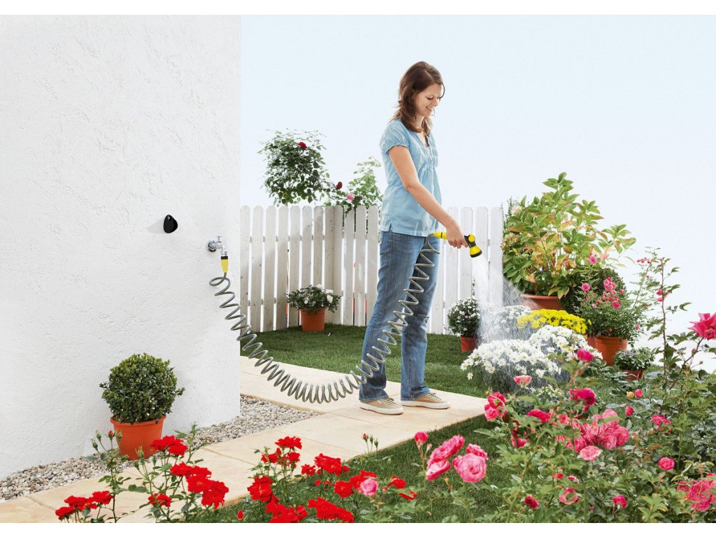 Súprava spirálových hadíc Kärcher ponúka ideálne predpoklady na pravidelné zavlažovanie v malých záhradách, na terasách, balkónoch alebo pri kempovaní. Už žiadne zdlhavé a namáhavé prenášanie kanvy na polievanie alebo ťahanie záhradných hadíc. Súprava spirálových hadíc Kärcher je tím správnym pomocníkom, ktorý je vždy pripravený na všetky druhy zavlažovania. Vlastnosti: 10 m spirálová hadica, bez ftalátov, odolná voči UV záreniu, multifunkčná. polievacia pištoľ, 1 x spojka na spirálovú hadicu s ochranou proti zlomeniu, 1 x spojka na spirálovú hadicu s ochranou proti zlomeniu a Aqua Stop, prípojka na vodovodný kohout G3/4, prípojka na vodovodný kohoutok pre vnútorné armatúry a násten. Pomocou štandardnej multifunkčnej striekacej pištole možno ľahko odstrániť aj hrubé nečistoty zo záhradného náradia. Špirálová hadica po každom použití opäť získa svoj kompaktný tvar a dá sa úsporne uložiť na nástenný držiak. Vďaka štandardne dodávanej prípojke na vodovodný kohout pre vnútorné príslušenstvo možno špirálovú hadicu pripojiť aj na kuchynský vodovodný kohout. 1 x hadicová spojka s ochranou proti zlomeniu 1 x hadicová spojka s ochranou proti zlomeniu a vodnou zarážkou Pripojenie na vodovodný kohout G3/4 Už žiadne navíjanie a odvíjanie ťažkých hadíc, žiadne nosenie ťažkých záhradných hadíc. Mosadzná závitová prípojka pre vnútorné armatúry Na pripojenie špirálovej hadice ku kohoutkom v dome Multifunkčná striekací pištoľ so 4 vzormi striekania Po použití sa hadica vždy vráti do pôvodného tvaru. Perfektne sa hodí pre upratanú záhradu Špirálová hadica odolná voči UV žiareniu a záhybom (10 m) Zdravotne nezávadná Nástenný držiak Jednoduché umiestnenie na obvodové steny Technické údaje Hmotnosť (kg) 0,8 Hmotnosť vrátane obalu (kg) 1 Rozmery (dx š0 x0 x0 Pri pripájaní týchto výrobkov na sieť pitnej vody je potrebné dodržiavať požiadavky normy EN 1717. V prípade potreby sa poraďte s odborníkom. Zariadenie Bodový paprsek OBLASTI POUŽITIA Na zavlažovanie malých až stredne veľkých plôch a záhrad Na zavlažovanie úžitkových rastlín (malé plochy, jednotlivé rastliny, rastliny v kvetináčoch) Na zavlažovanie okrasných rastlín (malé plochy, jednotlivé rastliny, črepníkové rastliny) Na čistenie záhradnéhoDodatočné parametre
