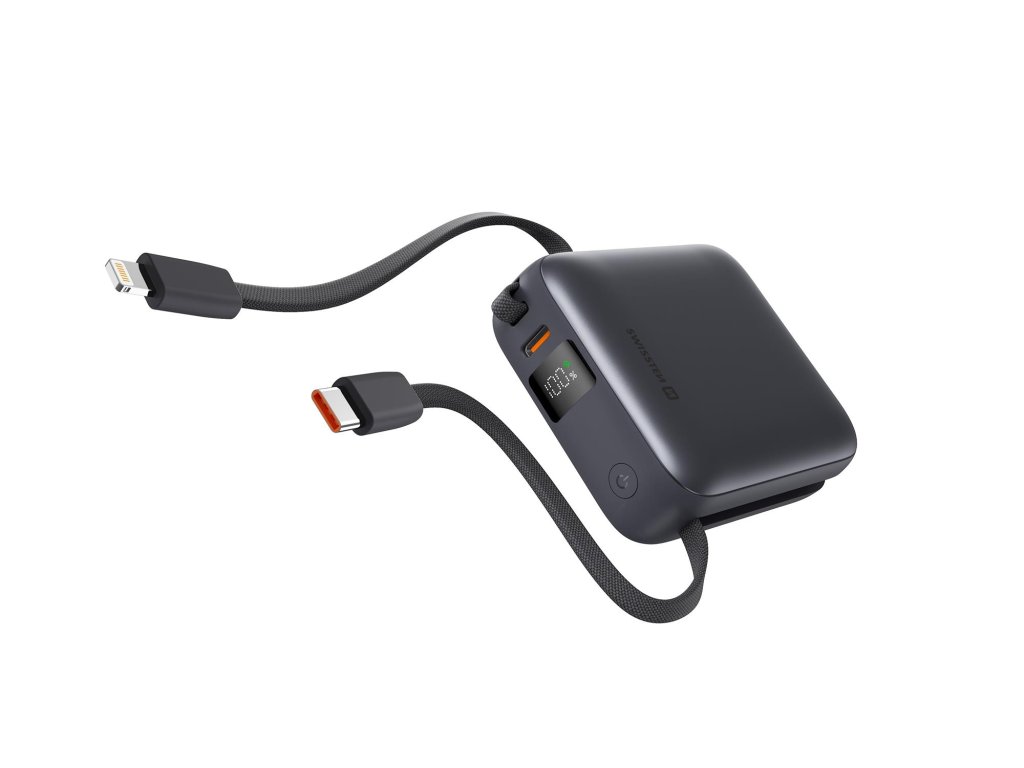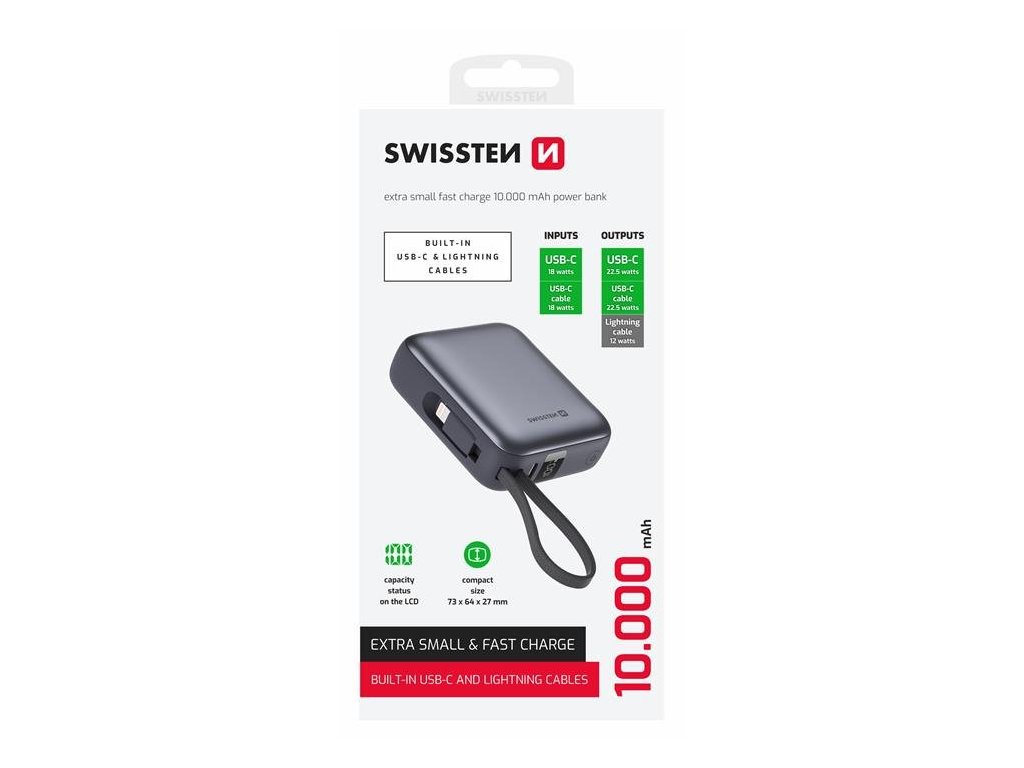 Hľadáte ľahkú a kompaktnú powerbanku, ktorá v sebe spája eleganciu a praktickosť? Našli ste tú správnu! SWISSTEN POWER BANK 10 000 mAh v priestorovo striebornej farbe je ideálnou voľbou pre užívateľov, ktorí ocenia pohodlie bez kompromisov na úkor výkonu. Vďaka integrovaným káblom USB-C a Lightning môžete ľahko nabíjať zariadenia so systémom Android aj iPhone kedykoľvek a kdekoľvek. Kompaktný výkon so štýlom Napriek malým rozmerom poskytuje táto powerbanka prostredníctvom portu USB-C a kábla až 22,5 W výstupného výkonu, čím zabezpečuje rýchle a spolehlivé nabíjanie smartfónov, tabletov a ďalších zariadení. Integrovaný kábel Lightning ponúka až 12 W výkonu, čo je ideálne na rýchle nabíjanie iPhonov a ďalších zariadení Apple. Elegantný dizajn a odolnosť Vysokokvalitné materiály vrátane ohňovzdorného plastu ABS a polykarbonátu robia z tejto powerbanky štýlové a odolné príslušenstvo. Vďaka kompaktným rozmerom a nízkej hmotnosti (len 175 g) sa ľahko prenáša v kapse, kabelke alebo batohu. Prehľadný displej LCD vás informuje o stave nabitia, takže vždy budete vedeť, kedy je čas powerbanku dobiť. Výhody powerbanky: Integrované káble USB-C a Lightning na pohodlné nabíjanie bez nosenia ďalšieho príslušenstva. Kompaktný a ľahký dizajn, ideálny na cestovanie a každodenné používanie. Výstupný výkon až 22,5 W na rýchle nabíjanie smartfónov a iných zariadení. LCD displej na jednoduché zobrazenie zostávajúcej kapacity batérie. Kvalitné materiály pre odolnosť a bezpečnosť. Špecifikácia: Kapacita 10 000 mAh (3,85 V, 38,5 Wh). Typ batérie Li-Polymer. Rozmery: 7,3 x 6,4 x 2,7 cm Hmotnosť: 175 g Materiál: Ohňovzdorný plast ABS + polykarbonát Indikátor stavu nabitia: LCD displej Vstupy: 1: USB-C: 5,0 V DC 3,0 A, 9,0 V DC 2,0 A/12,0 18 W Kabel USB-C: 5,0 V DC 3,0 A, 9,0 V DC 2,0 A, 12,0 V DC 1,5 A / Max. 18 W Výstupy: USB-C: 5,0 V DC 3,0 A, 9,0 V DC 2,22 A, 10,0 V DC 2,25 A, 12,0 V DC 1,67 A / Max. 22,5 W Kabel USB-C: 5,0 V DC 3,0 A, 9,0 V DC 2,22 A, 10,0 V DC 2,25 A, 12,0 V DC 1,67 A / Max. 22,5 W Kabel Lightning: 5,0 V DC 2,4 A/max. 12 W PPS: 5,0-5,9 V DC 3,0 A, 5,0-11,0 V DC 2,0 A/Max. 22 W Pri nabíjaní viacerých zariadení súčasne sa výkon 15 W rozdelí.Dodatočné parametre