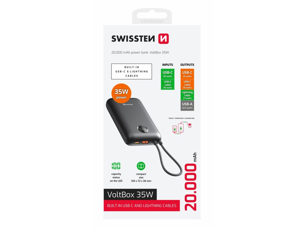 SWISSTEN POWER BANK VOLTBOX 35W 20000 mAh S INTEGROVANÝM USB-C A SVETELNÝMI KÁBLAMI ČIERNA