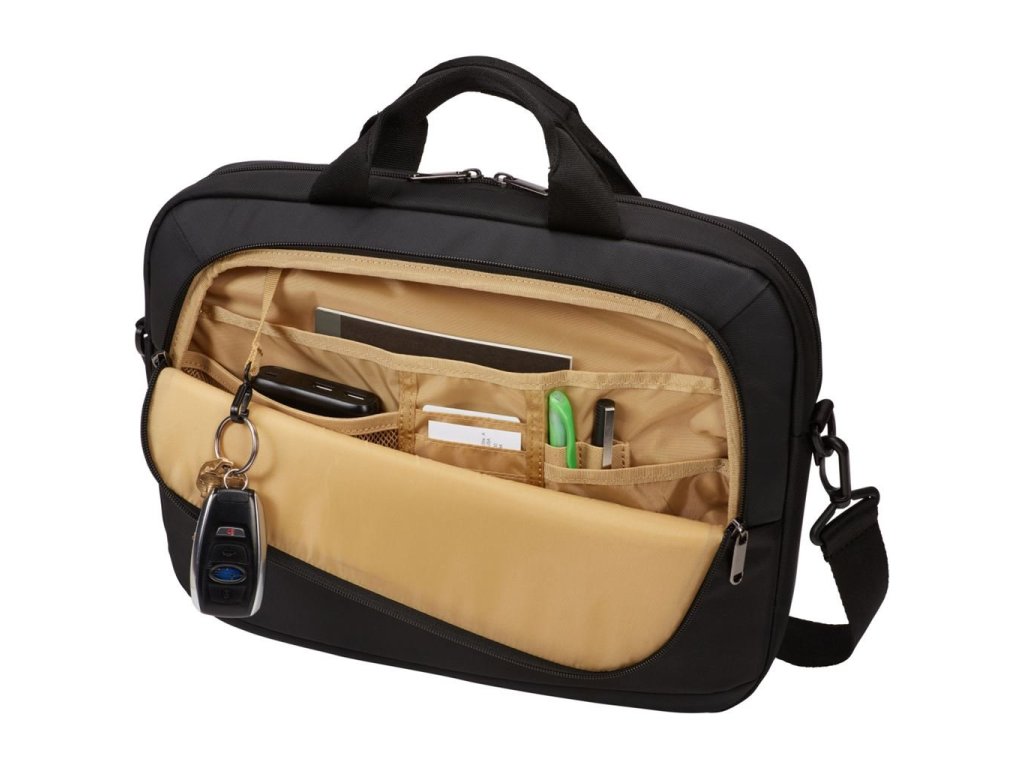 Elegantná taška na notebook s ochranným úložným priestorom na pracovný deň alebo služobnú cestu. Polstrovaný úložný priestor pre až 14" notebook. Výsuvné vrecko na tablet do veľkosti 12". Organizér s úložným priestorom na notebook, drobné príslušenstvo a kľúče. Rýchlo prístupné predné vrecko na drobnosti. Vyhradené vrecko na dokumenty. Popruh na pripevnenie k teleskopickej rukoväti kufra. Polstrovanie na ramennom popruhu. Odnímateľný ramenný popruh s otočnými háčikmi. Polstrované rukoväte. Farba: čierna Materiál: polyester, PE pena Vonkajšie rozmery: 37,0 x 7,0 x 30,0 cm Priehradka na notebook: 34,8 x 2,5 x 24,3 cm Objem: 10 l Hmotnosť: 0,54 kgDodatočné parametre