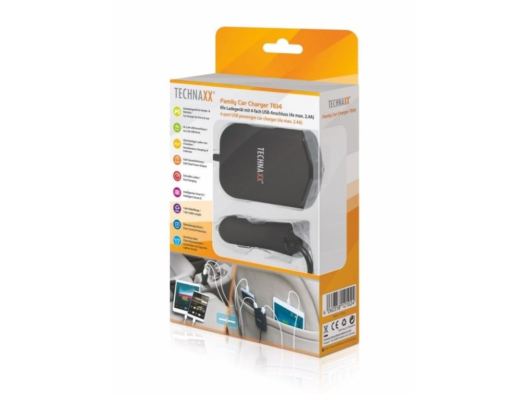Technaxx Family Car Charger TE14 VLASTNOSTI Súbežné nabíjanie 4 zariadení s portom USB (chytré telefóny, tablety, ai) Inteligentný Smart IC pre automatickú detekciu maximálneho prúdu zariadenia 1,8 m dlhý kábel spája obe nabíjačky dohromady Držiak pre upevnenie nabíjačky Nadprúdová ochrana Kompatibilné pre takmer všetky zariadenia s USB portom Jednoduchá manipulácia a praktická veľkosť TECHNICKÁ ŠPECIFIKÁCIA Vstupné napätie: DC 12–24V (zásuvka zapaľovača cigariet) Výstupný výkon predná nabíjačka: 2x USB port s každým DC 5V/2,4A Výstupný výkon 5V/2,4A Maximálny celkový výkon nabíjačky: 9,6A Hmotnosť: 129g (vrátane kábla o dĺžke 1,8m) Rozmery predná nabíjačka: (D) 6,5 x (Š) 2,5 x (V) 3,5cm Rozmery zadná nabíjačka: (D) 5,4 Obsah balenia: Rodinná nabíjačka do vozidiel TE14 • Držiak na zadné sedadlá • Návod na obsluhuDodatočné parametre