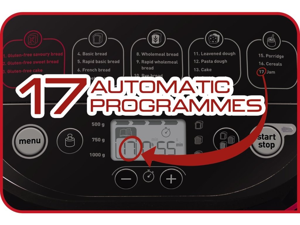 3 nastavenia hmotnosti (500g – 750g – 1000g) 3 nastavenia zafarbenia kôrky (svetlá / stredná / tmavá) 17 automatických programov : 10 programov: Bezlepkový chlieb, Sladký bezlepkový chlieb, Bezlepkové koláče, Základný chlieb, Rýchly základný chlieb, Rýchly základný chlieb, rýchly celozrnný chlieb, sladký chlieb/brioška, ražný chlieb 6 programov: cesto na pizzu, cestoviny, koláč, kaša, cereálie, džem 1 program iba pečenie Parametre: logo nutrilon Plastový povrch Kapacita: 1kg Odložený štart: až 1kg nádoba na pečenie a hnetacia lopatka Intuitívny ovládací panel s veľkým LCD displejom Príslušenstvo: knižka s 28 receptami, odmerka a lyžica, hnetacia lopatka a hák Príkon: 650WDodatočné parametre