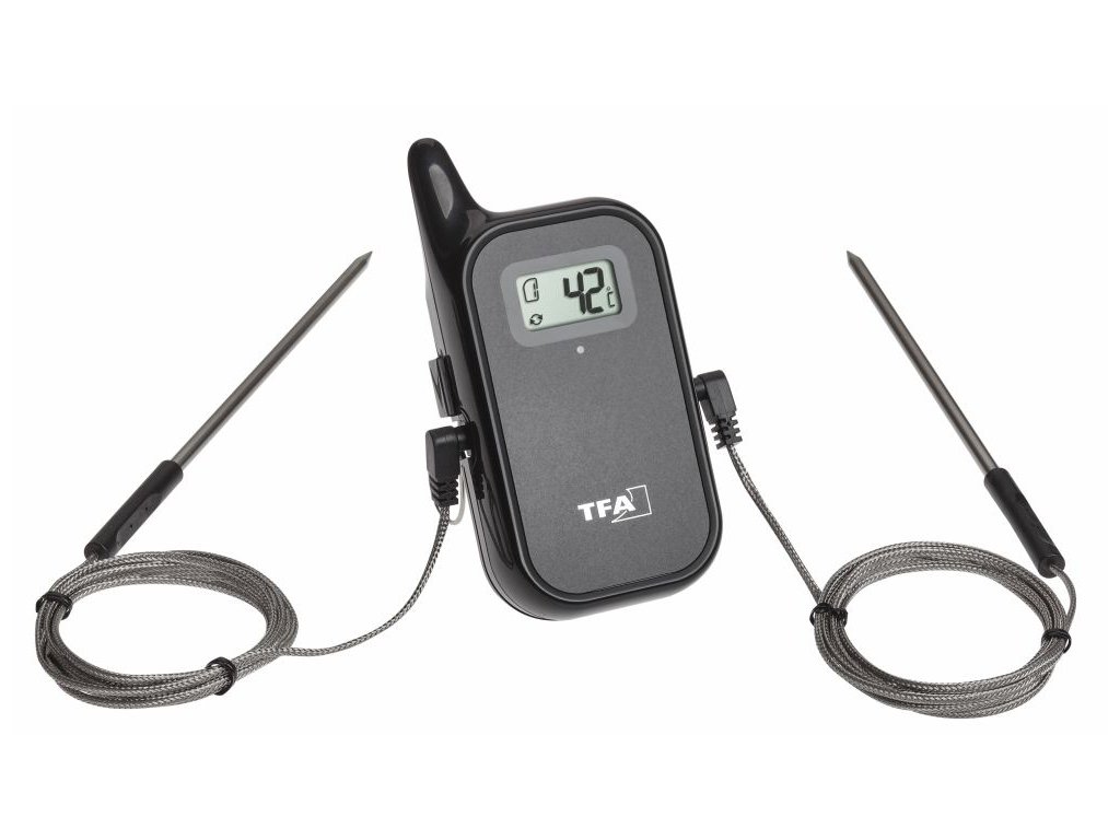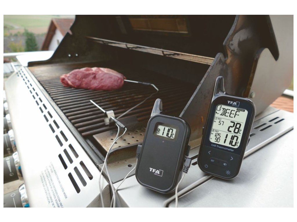 Ako pripraviť mäso a drôbež rovnakým spôsobom? Kontrolou teploty v strede masa! Varte ako profesionál so 100% zárukou. Špeciálne vlastnosti: Bezdrôtový grilovací teplomer TFA KÜCHEN-CHEF TWIN má dva senzory z nehrdzavejúcej ocele. Pomocou nich môžete sledovať teplotu v rúre alebo na grile nastavením hornej a dolnej hranice teploty alebo skontrolovať teplotu priamo uprostred dvoch kusov masa naraz. Navyše nemusíte hoci ani v kuchyni, pretože údaje sa prenášajú bezdrôtovo z vysílača do základne zariadenia. Môžete tak zamestnať seba alebo svojich hostí, zatiaľ čo sa vaše maso pripravuje dokonale. A keď je teplota taká akorát, teplomer vás upozorní zvukovým signálom. Jednoducho - vařte ako šéfkuchár! Vlastnosti a funkcie Na optimálnu prípravu masa a drôbeže, použiteľné pre grily a trúby. Vysielač s dvoma ihlovými sondami z nehrdzavejúcej ocele a káblom dlhým približne 1 ms dosahom max. 100 m . Možnosť monitorovania teploty vo vnútri grilu alebo rúry pomocou dvoch sond Možnosť nastavenia horného a dolného teplotného alarmu alebo cieľovej teploty až pre 2 kusy masa (grilovanie, pečenie) Ideálne aj na monitorovanie varenia pri nízkých teplotách vepové, kurácie, morčacie, ryby a hamburger rare, medium, medium rare a rare steak Nastaviteľné vlastné hodnoty teploty Zvukový alarm pri dosiahnutí určitej teploty Podsvietenie displeja Technické parametre Prijímač Vysielač Rozsah merania v trúbe: 0 °C až +300 °C 1 °C Rozsah: 100 m na otvorenom priestranstve HHH/LLL Teplota mimo intervalu merania Frekvencie: 433 MHz Batérie: 2x 1,5 V batérie AAA (nie sú súčasťou balenia) Rozmery: 60(65) x 21(33) x 142 mm Atéria: 2x 100 g (bez baterií a snímača) Rozmery: 60 x 24 x 122 mm Hmotnosť: 66 g (len prístroj)Dodatočné parametre