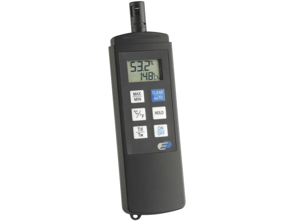 Profesionálny teplomer s vlhkomerom a meraním rosného bodu. Je to presné zariadenie na kontrolu teploty v rozsahu -40 °C až +70 °C s presnosťou +/- 0,5 °C. Prístroj meria aj vlhkosť v rozsahu od 1 % do 99 % s presnosťou +/- 3 %. Je možné ho kalibrovať (kalibračný certifikát vydaný príslušnou akreditovanou laboratóriou), pamätá si max. a min. namerané hodnoty. Medzi ďalšie funkcie prístroja patrí funkcia HOLD, meranie rosného bodu a teploty vlhkého teplomera ( Technické informácie: Rozmery: 170 x 50 x 17 mm. Hmotnosť: 100 g. 3% Napájanie: 2x 1,5 V AAADodatočné parametre