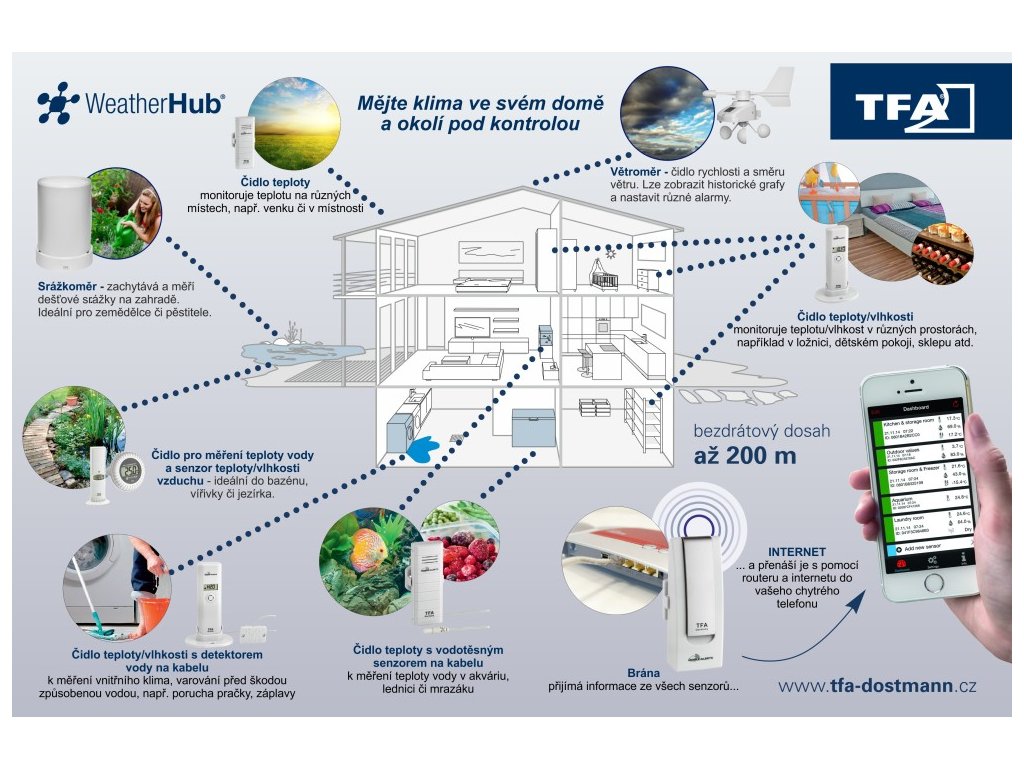 WEATHERHUB alebo bezdrôtový monitor klimy je inteligentné zariadenie na bezdrôtové ovládanie klimatických podmienok doma alebo v práci. Toto zariadenie doslova premení váš smartfón alebo tablet na mobilnú meteorologickú stanicu. Pomocou monitorovacieho systému WEATHERHUB môžete kedykoľvek a odkiaľkoľvek sledovať vnútornú a vonkajšiu teplotu, vlhkost vo svojom dome, chate alebo kancelárii, množstvo zrážok a silu a smer vetra vo vašej oblasti. Okrem základného snímača, ktorý dostanete v tomto balení, máte možnosť rozšíriť svoj systém WeatherHub® o ďalšie modely snímačov. Pri pohľade na portfólio ponúkaných kompatibilných snímačov môžete usúdiť, že existuje značné množstvo možností ich využitia. snímače tak môžete použiť nielen na bežné monitorovanie teploty a vlhkosti v domácnosti a venku, ale napríklad aj na monitorovanie zrážok alebo na monitorovanie teploty chladničky či vody v akváriu/bazéne. K dispozícii je aj snímač na detekciu vody, ktorý vás môže informovať o tom, že ste nechali pustiť vodu alebo že umývačka riadu/práčka vypustila vodu. Úplný zoznam všetkých doteraz dostupných senzorov spolu s podrobnejšími informáciami nájdete nižšie. Systém WeatherHub prináša nový rozmer ovládania domácnosti tým, že vám umožňuje monitorovať klímu vo vašej domácnosti prakticky odkiaľkoľvek na svete. Funkcia systému WEATHERHUB: Brána môže prijímať údaje až z 50 bezdrôtových snímačov. Prehľadná a bezplatná aplikácia pre tablet alebo smartfón (Android, iOS) umožňuje sledovať aktuálne poveternostné podmienky, nastaviť alarmy pre namerané hodnoty a zobraziť históriu merania za posledných 90 dní. Ako príslušenstvo sú k dispozícii ďalšie snímače na meranie teploty, vlhkosti, zrážok, rýchlosti a smeru vetra, detektory vody, dverové alebo okenné kontakty. TIP: Kliknutím na vyššie uvedený odkaz si nainštalujte aplikáciu do svojho smartfónu alebo tabletu. Aj keď nemáte zakúpený startovací balíček alebo snímač, môžete si aplikáciu vyskúšať, pretože vybrané testovacie snímače sú po nainštalovaní k dispozícii v aplikácii. Údaje z vybraných snímačov (napr. 30.3302.02, 30.3312.02 a 30.3313.02) si môžete prezrieť aj vo webovom prehliadači prostredníctvom platformy WeatherHub Observer. Predpokladom prevádzky je káblové pripojenie k smerovaču (prepínaču) s dostupným internetovým pripojením. Môžete si vybrať z nasledujúcich súprav: TFA 31.4001.02 WEATHERHUB - sada č. 1 - sada obsahuje bránu, snímač teploty - ideálna štartovacia sada na meranie teploty v detskom izbe, ložnici alebo pivnici. TFA 31.4002.02 WEATHERHUB - súprava č. 2 - súprava obsahuje bránu, snímač teploty s káblom - štartovacia súprava vhodná pre každého, kto má bazén, terárium, akvárium alebo chce sledovať teplotu v mrazničke, chladničke atď. TFA 31.4003.03 WEATH. dešťový senzor - štartovacia sada vhodná pre všetkých, ktorí chcú sledovať množstvo zrážok, napr. v záhrade. TFA 31.4004.02 WEATHERHUB - sada č. 4 - sada obsahuje bránu, snímač teploty s káblom, dešťomer - štartovacia sada vhodná pre všetkých, ktorí majú bazén, terárium, akvárium alebo chcú sledovať teplotu v mrazničke, chladničke a zároveň sledovať množstvo zrážok v záhrade. TFA 31.4005.02 WEATHERHUB - súprava č. 5 - brána, snímač teploty/vlhkosti, dešťomer, vetromer - domáca meteostanica vhodná pre všetkých, ktorí chcú mať okamžitý a úplný prehľad o počasí TFA 31.4006.02 WEATHERHUB - súprava č. 6 potrebujú merať rýchlosť a smer vetra. TFA 31.4007.02 WEATHERHUB - súprava č. 7 - brána, bezdrôtový teplomer/vlhkomer + 3x snímače teploty/vlhkosti - ideálny na monitorovanie teploty a vlhkosti na viacerých miestach, obsahuje aj konzolu s displejom, takže informácie majú ostatní členovia domácnosti okamžite po ruke TFA 30.4. - brána, vnútorný teplomer/vlhkomer, snímač teploty a vlhkosti - ideálna sada pre tých, ktorí chcú žiť zdravo a sledovať ideálnu klímu v domácnosti, tj správnu teplotu a vlhkost, prevenciu proti pliesniam a suchému vzduchu, aplikácia poskytuje rady, kedy vetrať atď. TFA 31.4010.02 WEA 3x snímač teploty s káblom - štartovacia sada vhodná pre tých, ktorí potrebujú merať teplotu na viacerých miestach - napr. chladničky, mrazničky, serverovne, teráriá, bazény, nádrže atď. TFA 31.4011.02 WEATHERHUB - sada č. terária, akvária alebo chcú sledovať teplotu v mrazničke, chladničke atď. TFA 31.4012.02 WEATHERHUB - sada č. 12 - sada obsahuje bránu, snímač teploty a vlhkosti - štartovacia sada vhodná pre všetkých, ktorí chcú merať teplotu a vlhkosť v záhrade, skleníku, sklade. TFA 31.4013.02 WEATHERHUB - súprava č. 13 - súprava obsahuje bránu, snímač teploty s káblom - štartovacia súprava vhodná pre všetkých, ktorí potrebujú čo najpresnejšie merať teplotu - v soláriách, saunách, bazénoch, sklepoch alebo skladoch. Ďalšiesnímače a moduly, ktoré je možné dokúpiť: TFA 30.3300.02 - Snímač teploty - ideálny na meranie teploty na inom mieste, napr. v detskom izbe, ložnici, pivnici, skleníku atď. napr. v mrazničke, chladničke, akváriu alebo teráriu TFA 30.3302.02 - snímač teploty a vlhkosti s displejom s vodotesným káblovým senzorom - verzia PRO - meria teplotuDodatočné parametre