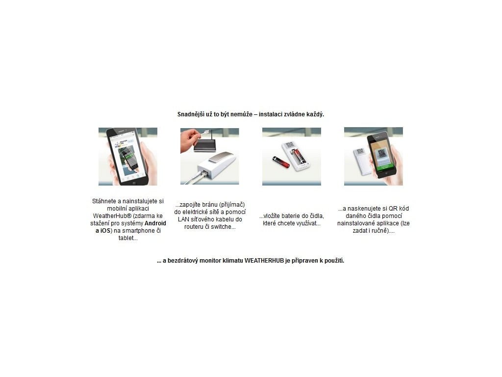WEATHERHUB alebo bezdrôtový monitor klimy je inteligentné zariadenie na bezdrôtové ovládanie klimatických podmienok doma alebo v práci. Toto zariadenie doslova premení váš smartfón alebo tablet na mobilnú meteorologickú stanicu. Pomocou monitorovacieho systému WEATHERHUB môžete kedykoľvek a odkiaľkoľvek sledovať vnútornú a vonkajšiu teplotu, vlhkost vo svojom dome, chate alebo kancelárii, množstvo zrážok a silu a smer vetra vo vašej oblasti. Okrem základného snímača, ktorý dostanete v tomto balení, máte možnosť rozšíriť svoj systém WeatherHub® o ďalšie modely snímačov. Pri pohľade na portfólio ponúkaných kompatibilných snímačov môžete usúdiť, že ich využitie je značné. Snímače možno použiť nielen na bežné monitorovanie teploty a vlhkosti v domácnosti av exteriéri, ale napríklad aj na monitorovanie zrážok alebo na monitorovanie teploty chladničky či vody v akváriu/rybníku. K dispozícii je aj snímač na detekciu vody, ktorý vás môže informovať o tom, že ste nechali pustiť vodu alebo že vám vytekala voda z umývačky riadu/práčky. Úplný zoznam všetkých doteraz dostupných senzorov spolu s podrobnejšími informáciami nájdete nižšie. Systém WeatherHub prináša nový rozmer ovládania domácnosti tým, že vám umožňuje monitorovať klímu vo vašej domácnosti prakticky odkiaľkoľvek na svete. Funkcia systému WEATHERHUB: Brána môže prijímať údaje až z 50 bezdrôtových snímačov. Prehľadná a bezplatná aplikácia pre tablet alebo smartfón (Android, iOS) umožňuje okrem monitorovania aktuálneho stavu počasia nastaviť alarmy pre merané veličiny a zobraziť históriu merania za posledných 90 dní. Ako príslušenstvo sú k dispozícii ďalšie snímače na meranie teploty, vlhkosti, zrážok, rýchlosti a smeru vetra, detektory vody, dverové alebo okenné kontakty. Údaje z vybraných snímačov (napr. 30.3302.02, 30.3312.02 a 30.3313.02) možno zobraziť aj vo webovom prehliadači prostredníctvom platformy WeatherHub Observer. Predpokladom prevádzky je káblové pripojenie k smerovaču (prepínaču) s dostupným internetovým pripojením. Môžete si vybrať z nasledujúcich súborov: TFA 31.4002.02 WEATHERHUB - sada č. 2 - sada obsahuje bránu, snímač teploty s káblom - štartovacia sada vhodná pre tých, ktorí majú bazén, terárium, akvárium alebo chcú sledovať teplotu v mrazničke, chladničke atď. TFA 31.400. bránu, dešťový senzor - štartovacia sada vhodná pre tých, ktorí chcú sledovať množstvo zrážok, napr. v záhrade. TFA 31.4004.02 WEATHERHUB - sada č. 4 - sada obsahuje bránu, snímač teploty s káblom, dešťomer - štartovacia sada vhodná pre všetkých, ktorí majú bazén, terárium, akvárium alebo chcú sledovať teplotu v mrazničke, chladničke a zároveň sledovať množstvo zrážok v záhrade. TFA 31.4005.02 WEATHERHUB - súprava č. 5 - brána, snímač teploty/vlhkosti, dešťomer, vetromer - domáca meteostanica vhodná pre všetkých, ktorí chcú mať okamžitý a úplný prehľad o počasí TFA 31.4006.02 WEATHERHUB - súprava č. 6 potrebujú merať rýchlosť a smer vetra. TFA 31.4007.02 WEATHERHUB - súprava č. 7 - brána, bezdrôtový teplomer/vlhkomer + 3x snímače teploty/vlhkosti - ideálny na monitorovanie teploty a vlhkosti na viacerých miestach, obsahuje aj konzolu s displejom, takže informácie majú ostatní členovia domácnosti okamžite po ruke TFA 30.4. - brána, vnútorný teplomer/vlhkomer, snímač teploty a vlhkosti - ideálna sada pre tých, ktorí chcú žiť zdravo a sledovať ideálnu klímu v domácnosti, tj správnu teplotu a vlhkost, prevenciu proti pliesniam a suchému vzduchu, aplikácia poskytuje rady, kedy vetrať atď. TFA 31.4010.02 WEA 3x snímač teploty s káblom - štartovacia sada vhodná pre tých, ktorí potrebujú merať teplotu na viacerých miestach - napr. chladničky, mrazničky, serverovne, teráriá, bazény, nádrže atď. TFA 31.4011.02 WEATHERHUB - sada č. terária, akvária alebo chcú sledovať teplotu v mrazničke, chladničke atď. TFA 31.4012.02 WEATHERHUB - sada č. 12 - sada obsahuje bránu, snímač teploty a vlhkosti - štartovacia sada vhodná pre všetkých, ktorí chcú merať teplotu a vlhkosť v záhrade, skleníku, sklade. TFA 31.4013.02 WEATHERHUB - súprava č. 13 - súprava obsahuje bránu, snímač teploty s káblom - štartovacia súprava vhodná pre všetkých, ktorí potrebujú čo najpresnejšie merať teplotu - v soláriách, saunách, bazénoch, sklepoch alebo skladoch. Ďalšie snímače a moduly, ktoré je možné dokúpiť: TFA 30.3300.02 - Snímač teploty - ideálny na meranie teploty na inom mieste, napr. v detskom pokoji, ložnici, pivnici, skleníku atď. napr. v mrazničke, chladničke, akváriu alebo teráriuDodatočné parametre