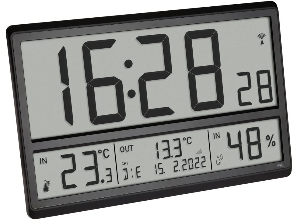Hodiny sú súčasťou základného vybavenia čakární, recepcií, kancelárií a verejných budov. Veľký, mimoriadne jasný displej hodín TFA 60.4523.01 je čitateľný z väčšej vzdialenosti. Čas sa zobrazuje v extrémne veľkom formáte a vždy na sekundu presne. Prechod z letného na zimný čas je automatický. Dátum sa vypisuje celý, takže orientácia v čase je veľmi jednoduchá a pohodlná. Zvláštnosťou týchto hodín je dvojité zobrazenie teploty pre vnútorné a vonkajšie použitie. Malý vysílač, ktorý je nainštalovaný venku, prenáša vonkajšiu teplotu rádiovým signálom s dosahom až 100 m. Používateľ môže nastaviť, či sa má na prvom riadku displeja zobrazovať vonkajšia teplota alebo čas veľkým písmom. Jednoduchý a prehľadný dizajn sa hodí do každého prostredia, či už chcete rádiové hodiny namontovať na stenu, alebo ich umiestniť na recepčný stôl. Okrem toho má zariadenie aj všetky funkcie budíka. Prehľadný XL displej Vysoko presný čas riadený DCF Zobrazenie vnútornej teploty/vlhkosti a vonkajšej teploty (max. dosah snímača 100 m) Zobrazenie dňa v týždni (8 svetových jazykov: nemčina, angličtina, francúzština, španielčina, italčina, dánčina, holandčina Nastaviteľné časové pásmo Nastaviteľný prvý riadok zobrazenia (čas alebo vonkajšia teplota) Technické informácie: Rozsah merania vonkajšej teploty: -50 °C až +70 °C Rozsah merania vnútornej teploty: -10 % až +50 °C Typ bezdrôtového snímača: TFA 30.3248.02 (je súčasťou dodávky) Vysielacia frekvencia snímača: 433 MHz Materiál: plast Napájanie: 4 x 1,5 V AA (nie je súčasťou dodávky) Napájanie bezdrátového snímača: 2 x 1,5 V AAA (nie je súčasťou dodávky) Rozmery hodín: 360 x 28 (84) x 235 mm Hmotnosť hodín: 8Dodatočné parametre