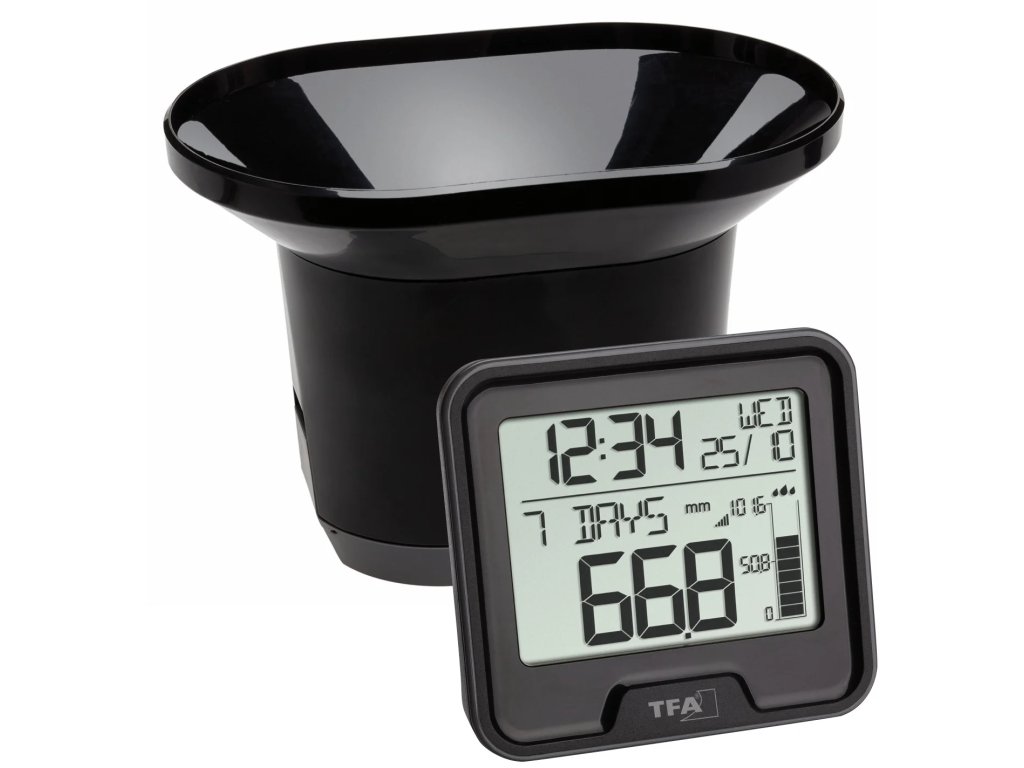 Nový zrážkomer TFA 47.3005.01 dokáže bezdrôtovo vysielať až do vzdialenosti 100 m. Ponúka aj grafické znázornenie množstva zrážok a zobrazenie za poslednú hodinu, 24 hodín, 7 dní, mesiac alebo rok a históriu zrážok za každý z posledných 12 mesiacov. Prístroj ponúka upozornenie pri prekročení nastaveného 24-hodinového limitu zrážok a zobrazuje aj vnútornú teplotu, aktuálny čas a dátum. Funkcie a vlastnosti Bezdrôtový prenos súčt zrážok (433 MHz), dosah do 100 m (voľná plocha) Indikácia a grafické zobrazenie zrážok za poslednú hodinu, 24 hodín, 7 dní, mesiac, rok a celkové zrážky Mesačná história zrážok pre každý mesiac za posledných 12 mesiacov Možnosť alarmu hodnoty zrážok upozorní na jeho prekročenie Vnútorná teplota Čas a dátum Ideálne pre záhradkárov a poľnohospodárov a všetkých, ktorí sa chcú dozvedieť viac o prírode Technické špecifikácie Základňa Rozsah merania - teplota 0 °C... +37 °C/+32 °F...+99 °F 30 (46) x 85 mm Hmotnosť 93 g (len prístroj) Snímač srážok Zhrnutie zrážok 0...9999 mm Rozlíšenie 0,1 mm Interval prenosu 45 sekund Rozsah max. 100 m (na otvorenom priestranstve) Prenosová frekvencia 433 MHz Maximálna rádiová 1,5 V (nie sú súčasťou dodávky) Rozmery 180 x 120 x 125 mm Hmotnosť 196 g (len prístroj)Dodatočné parametre